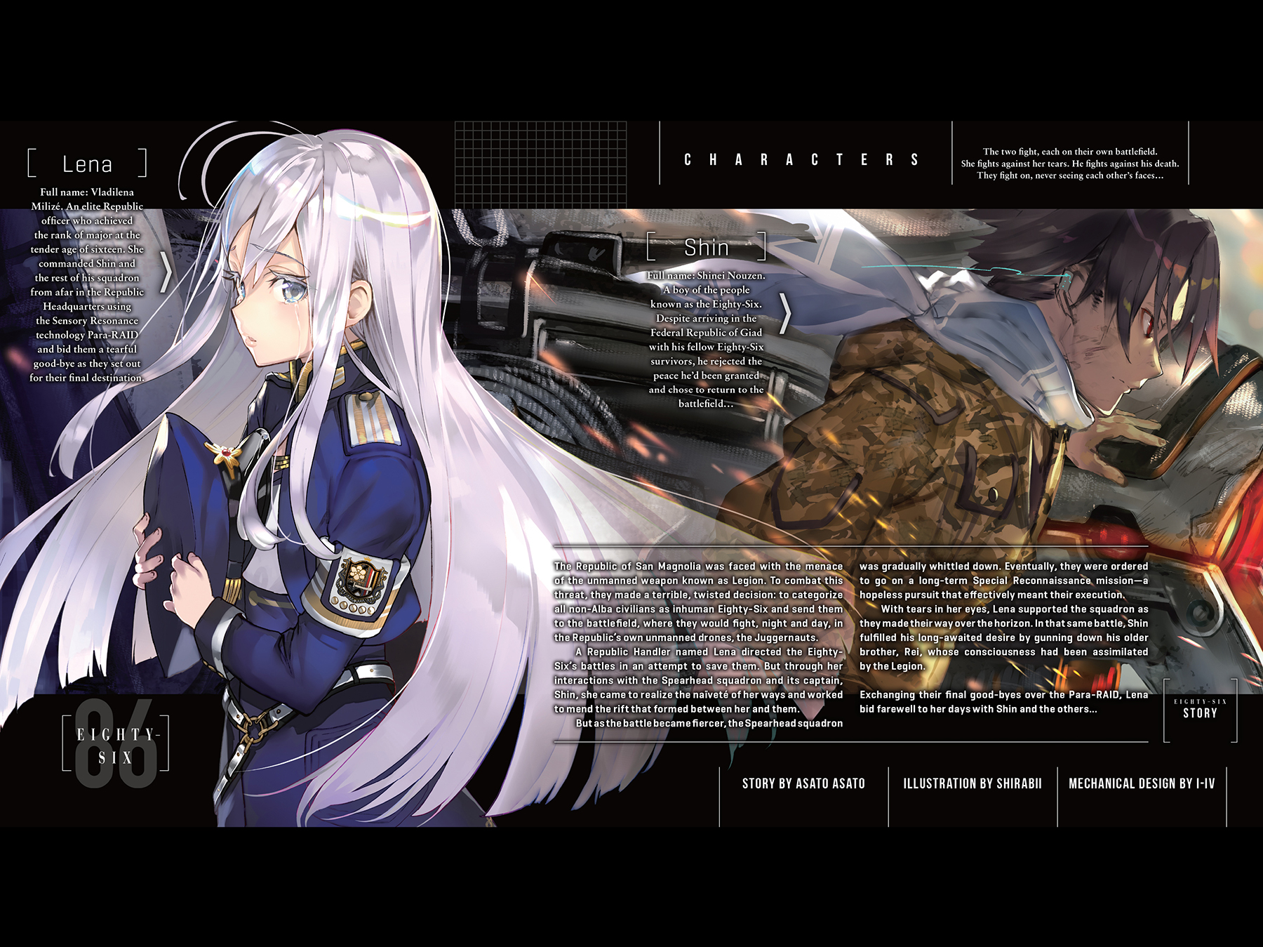 Dia mengenakan seragam hitam rapi, kaku, dan rambut peraknya mengalir seperti sutra, dengan pengecualian satu detik , yang telah diwarnai merah. Dia telah mengadopsi penampilan ini enam bulan yang lalu, ketika skuadron Spearhead — satu skuadron Eighty-Six — telah dikirim ke medan perang dalam misi bunuh diri. Karena mereka tidak diizinkan untuk kembali, satu-satunya pilihan mereka adalah untuk maju ke wilayah en emy sampai mereka terbunuh dalam aksi.