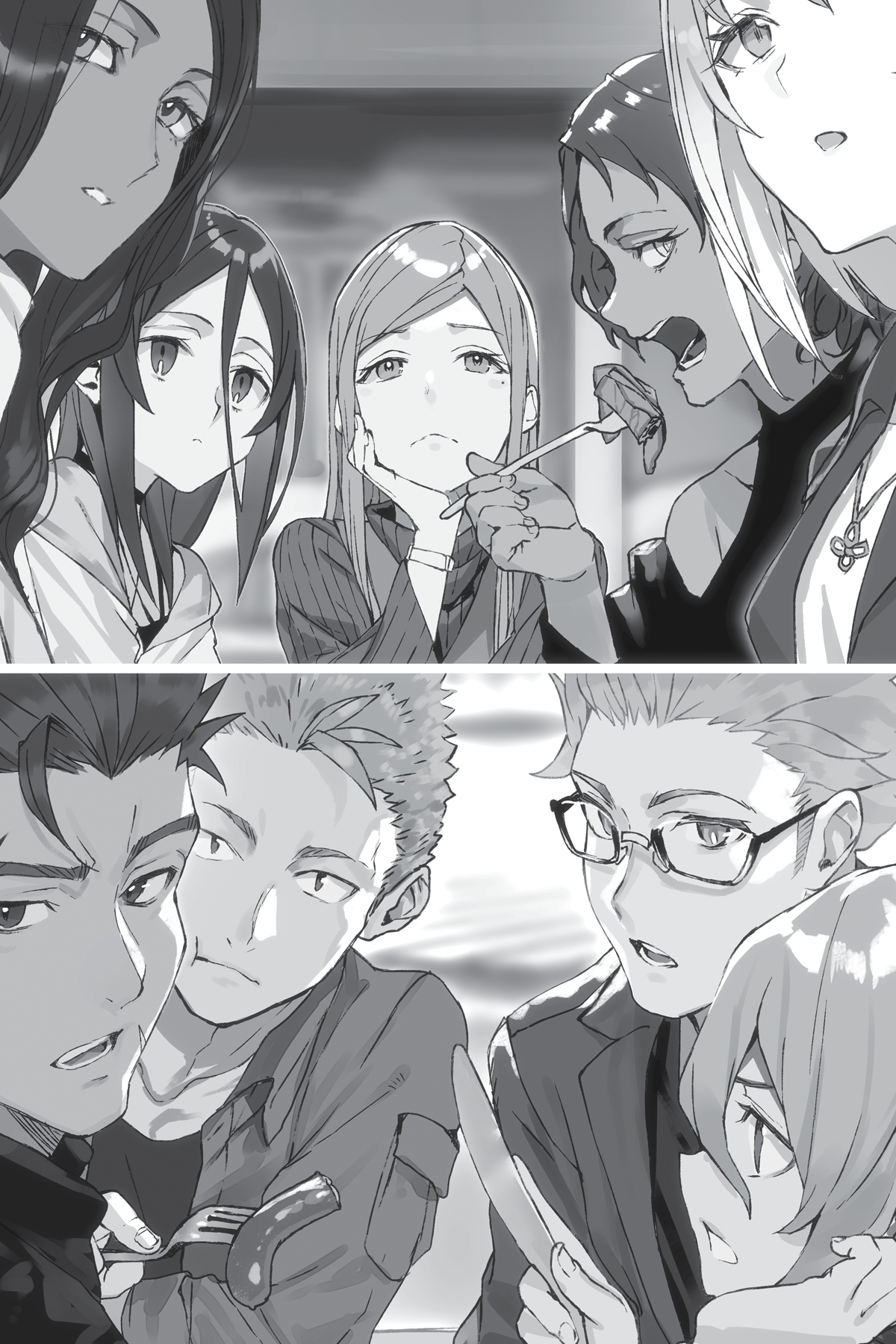 Pertukaran yang sama terjadi dari sisi Lena. Anju, Shiden, Annette, Michihi, dan Shana saling berbisik, meja mereka penuh dengan piring seperti yang lainnya.
