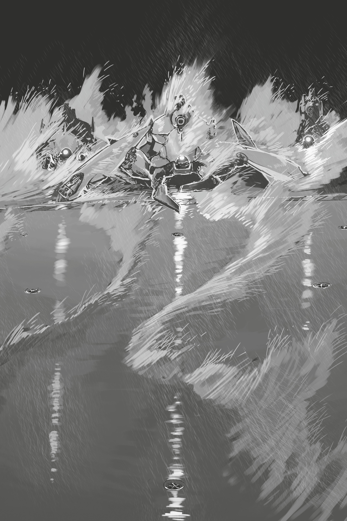 Kilatan petir menerangi awan saat hujan mengguyur mereka, cahaya memantul dari tetesan air hujan dan untuk sesaat memenuhi bidang penglihatan Shin dengan warna putih. Kesuraman dan gemuruh guntur memenuhi dirinya dengan rasa takut dan sesak napas, seolah-olah dia tenggelam ke kedalaman dingin laut gelap yang membentang di depan matanya. Awan hitam yang muncul di langit di atas adalah permukaan air, dan dek penerbangan yang diguyur hujan adalah dasar laut.