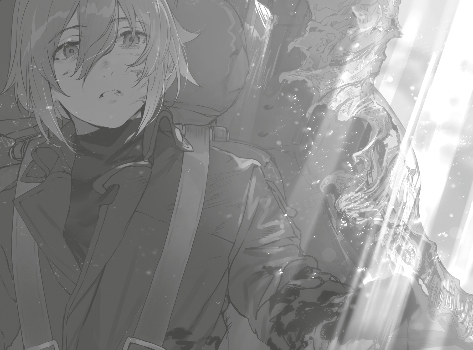 Jika dia menyentuh tanah, tidak mungkin dia bisa selamat. Sistem penyangga presisi tinggi Reginleif melakukan segala upaya untuk melindungi pilot, tetapi luka-lukanya masih cukup parah sehingga dokter militer akan dengan tegas memerintahkannya untuk beristirahat dan memulihkan diri.