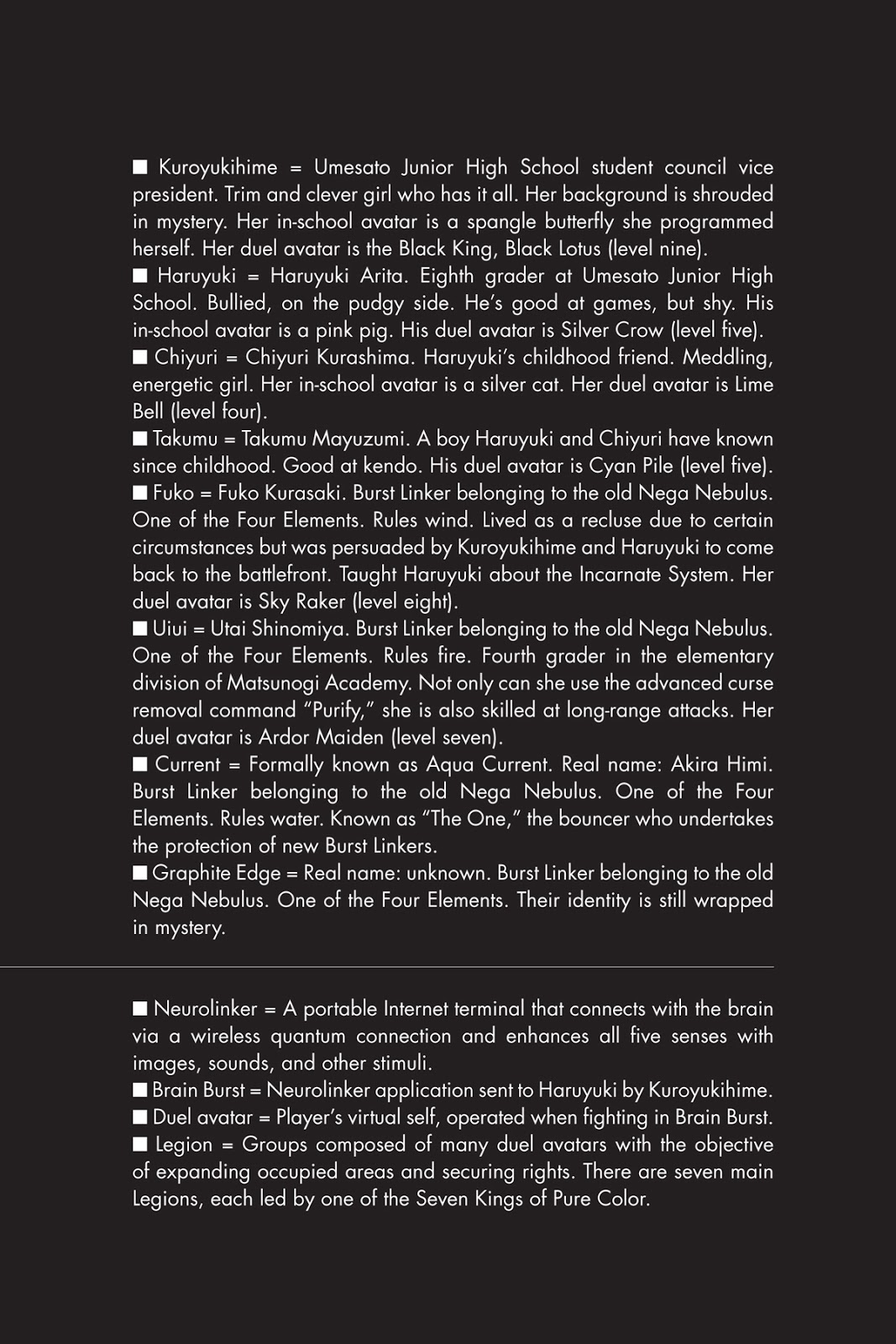 Pembicaranya adalah seorang gadis berseragam pelaut lengan pendek dengan poni asimetris, Burst Linker yang telah menjadi penyebab banyak perkelahian paling sengit Haruyuki. Dia juga anggota terbaru Nega Nebulus, yang baru saja bergabung dengan Legiun hari itu: Magenta Scissor / Rui Odagiri.