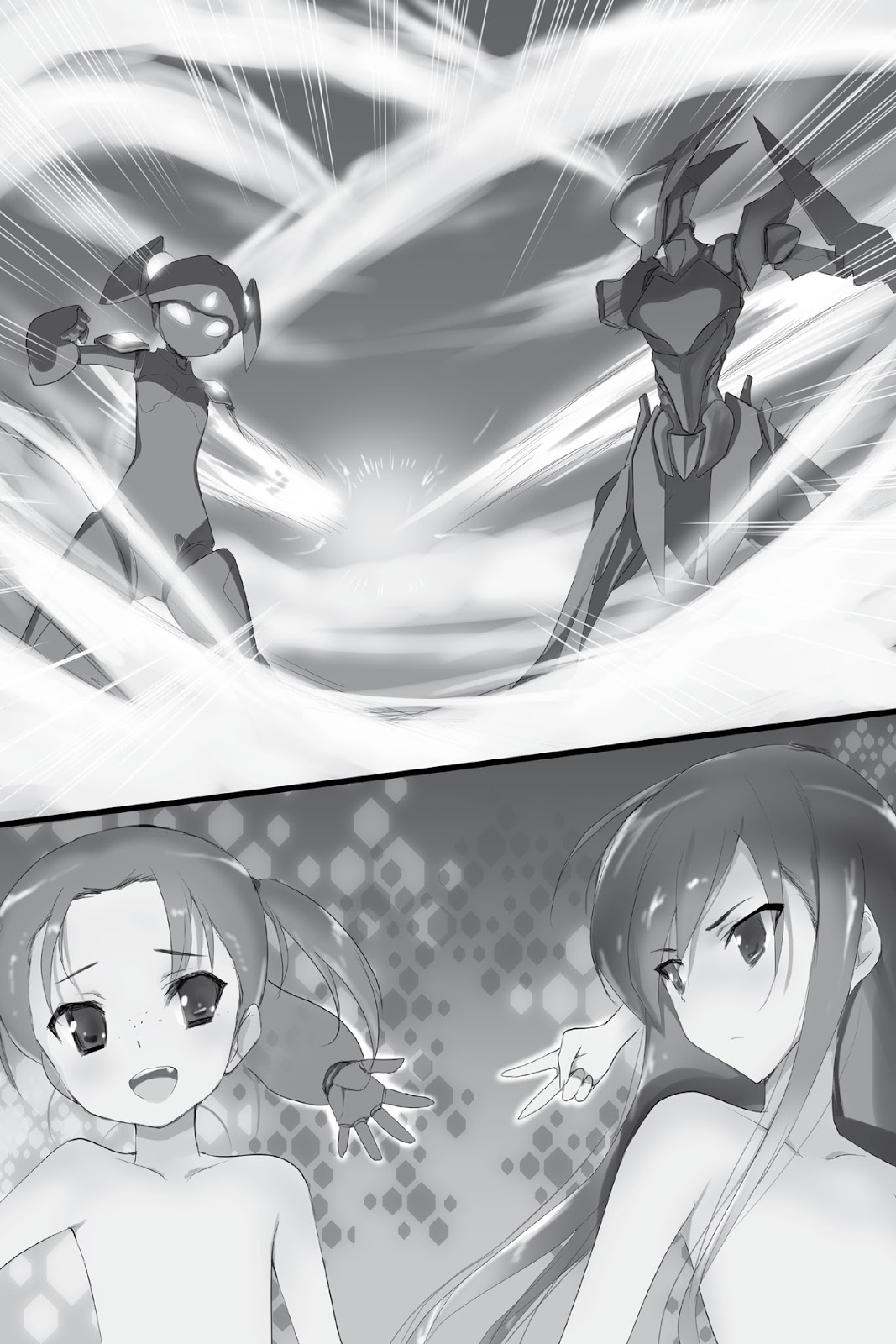 Sementara dia memikirkan ini, semua tombol YES tampaknya telah ditekan, karena teks yang menyala-nyala AB ATTLE R OYALE DIMULAI !! menyala di depan matanya, diikuti dengan hitungan mundur sepuluh detik. Pembacaan dengan cepat mencapai nol, dan pengukur kesehatan di kiri atas berubah dari Sky Raker menjadi milik Silver Crow. Di kanan atas, pengukur Burst Linker lainnya ditampilkan secara vertikal dalam format terkompresi.