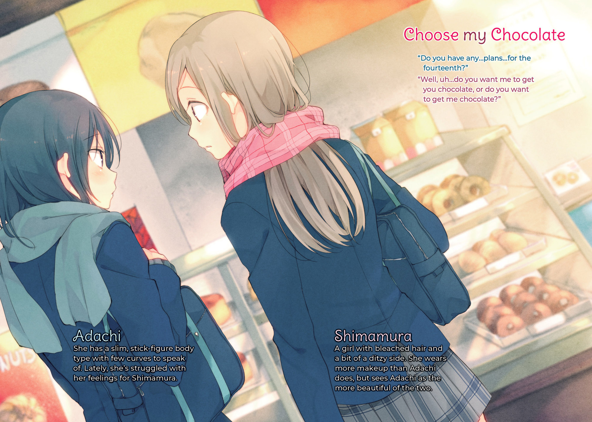 Toko kue juga menawarkan kue krim coklat “edisi terbatas”. Tapi, sejujurnya, aku tidak bisa membedakan mereka dari puff krim goreng coklat tua di sebelahnya. Aku memandang dari balik bahu Adachi ke poster di belakangnya dan menyadari untuk apa kue-kue cokelat edisi terbatas itu: Hari Valentine.