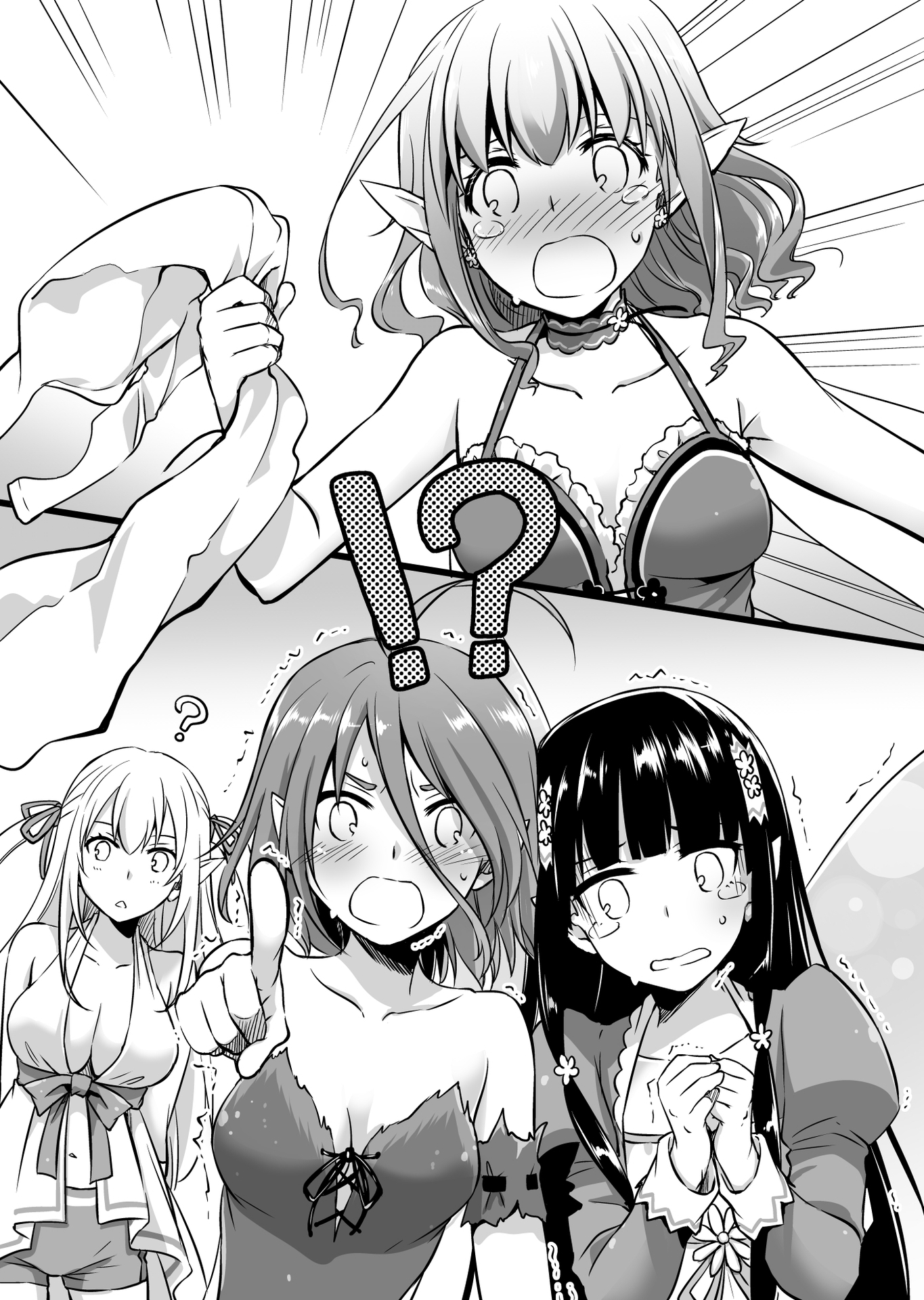 “Aku hanya fiiine!” Sylphie berseri-seri, menjulurkan dadanya yang besar; memang, dia sepertinya tidak keberatan sama sekali. Dia mengenakan celana pendek di bagian bawahnya, dan bagian atas adalah nomor kain tipis yang dirancang untuk menonjolkan payudaranya. Kostumnya tentu yang paling terbuka dari keempatnya, tapi dia benar-benar tampak nyaman dengan itu.