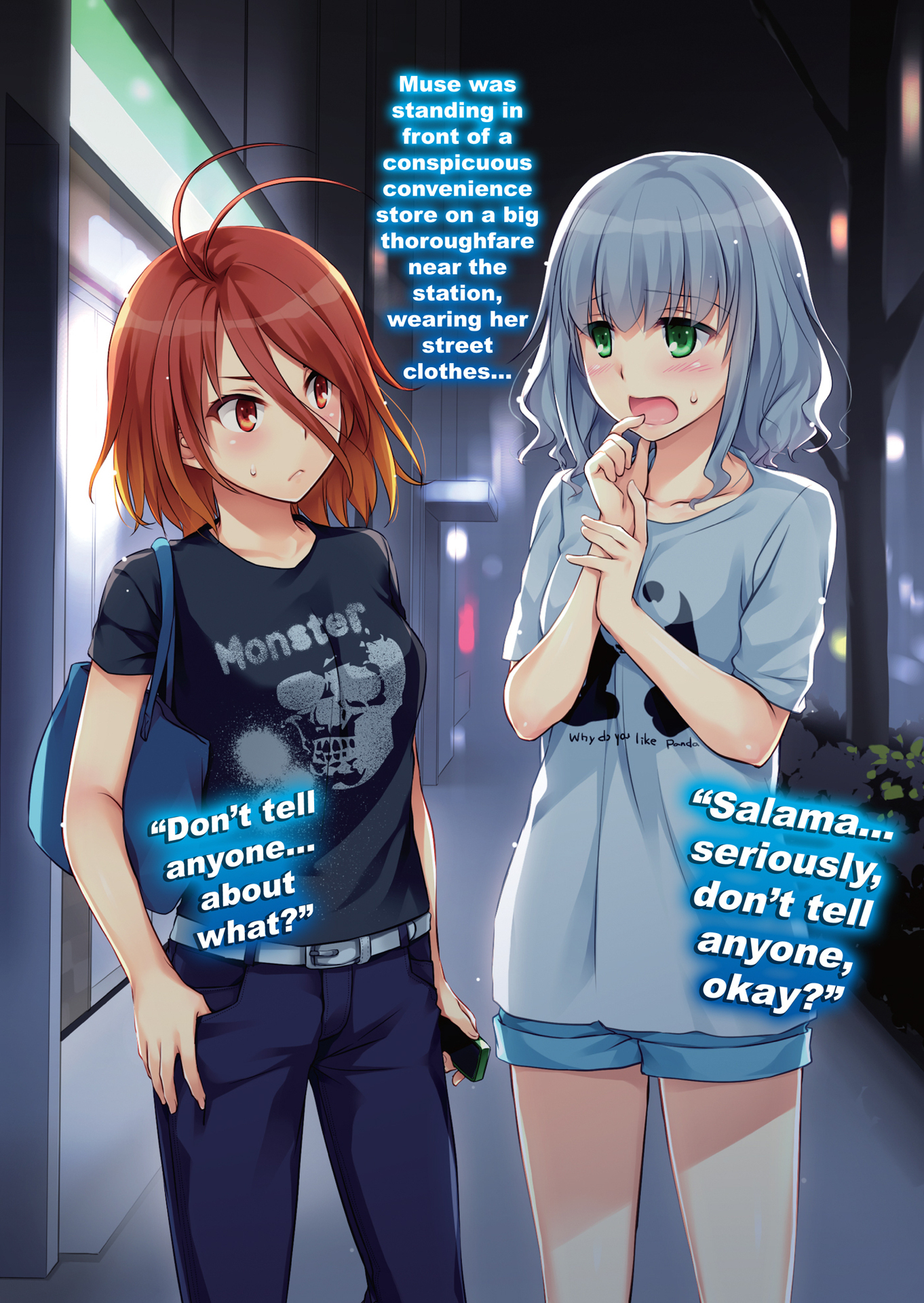 “Iya. Betul.” Muse menatap tanah. Bahunya, ditelanjangi oleh kostum panggungnya yang terbuka, gemetar. “… Apakah kamu ingat apa yang terjadi ketika kita pertama kali mengambil alih pekerjaan ini?” dia bertanya.