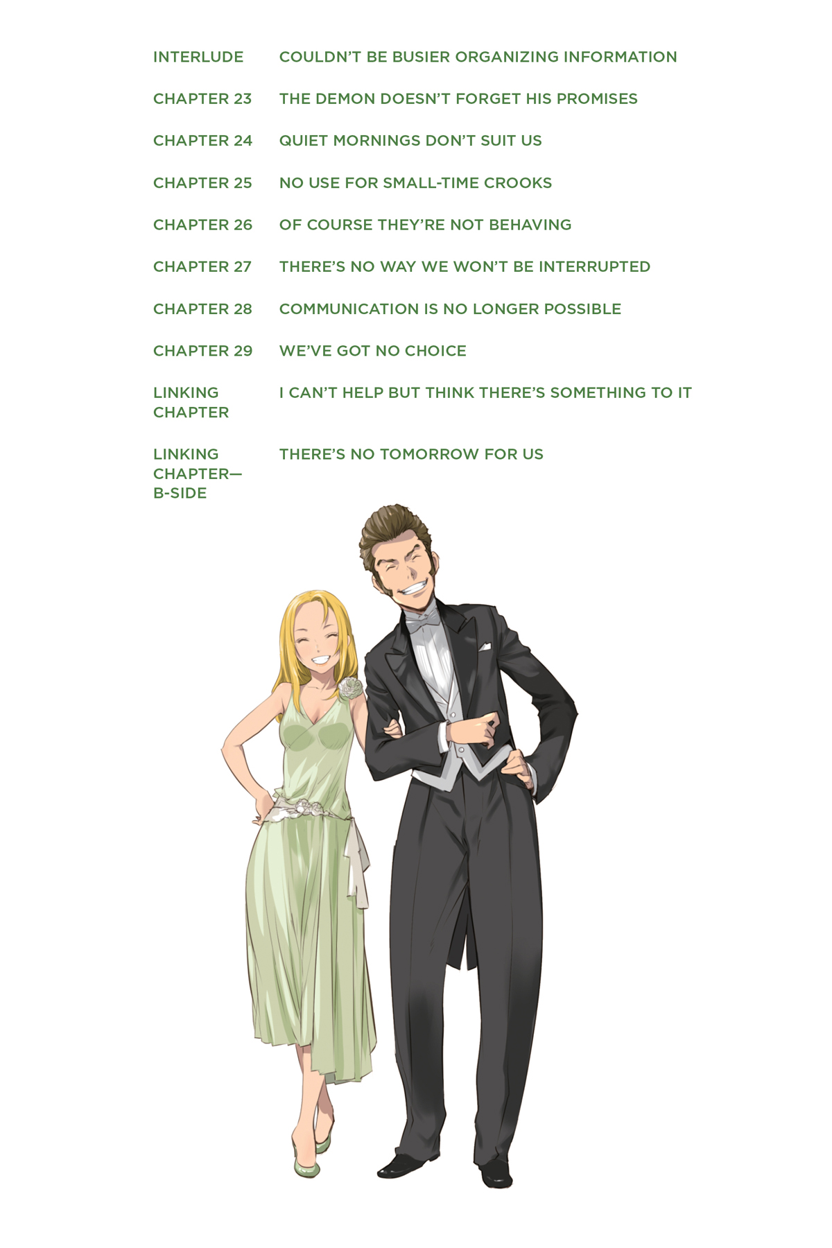 “Ada lima pemain utama. Sebuah ‘kelompok awal’ yang terdiri dari kenakalan remaja lokal dan Keluarga Russo, dibentuk di sekitar Camorra yang dikenal sebagai Keluarga Martillo. Keluarga Runorata, salah satu sindikat mafia terkemuka di Timur. Keluarga Gandor, yang telah menyewa sekelompok pembunuh bayaran. Sebuah kelompok teroris yang dipimpin oleh Huey Laforet yang abadi. Dan House of Dormentaire, kelompok keuangan besar tapi memudar yang melibatkan diri dari Eropa. Divisi Investigasi, Senator Beriam, dan staf Nebula juga terlihat mencurigakan di belakang layar…”