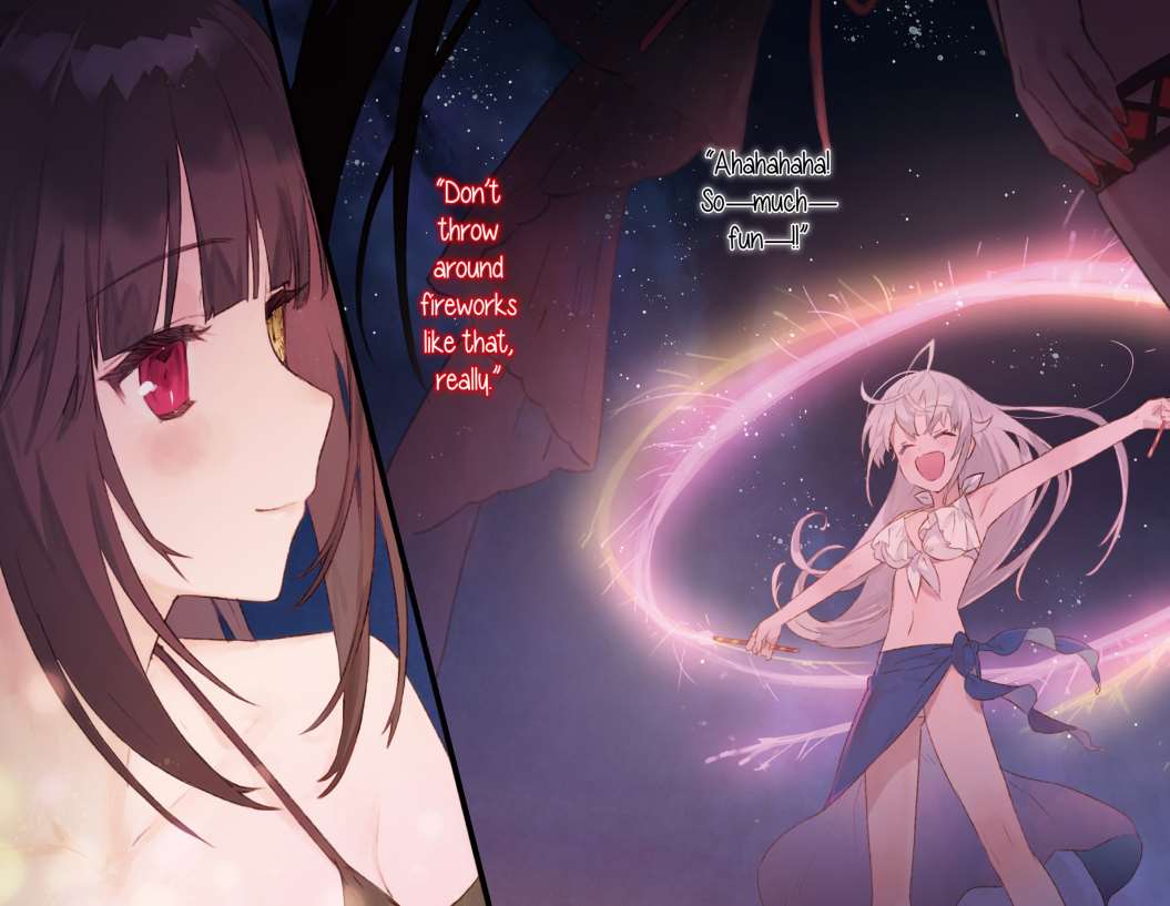 Batuk karena menelan secara paksa sejumlah besar air laut, Higoromo Hibiki memuntahkannya kembali ketika dalam keadaan bingung. Setelah menyentuh tutup pelindungnya, dia merasakan kelegaan karena ternyata masih utuh. Mendengar teriakan datang dari belakang, dia buru-buru bersembunyi di tanah.