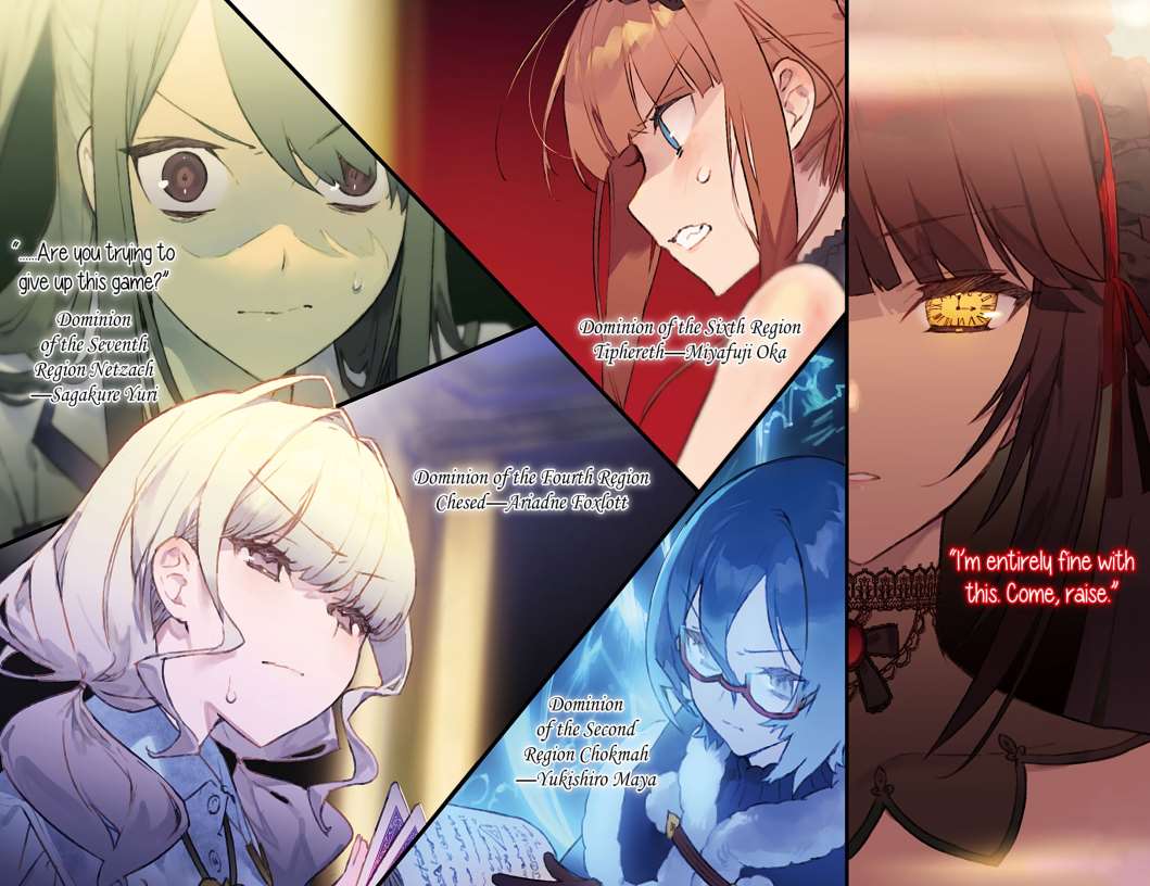 Gadis itu melompat ke gerbang yang terbuka──Tokisaki Kurumi, ketika gadis lain mengikuti setelah dia──Higoromo Hibiki. Keduanya berangkat ke Netzach Region Ketujuh.