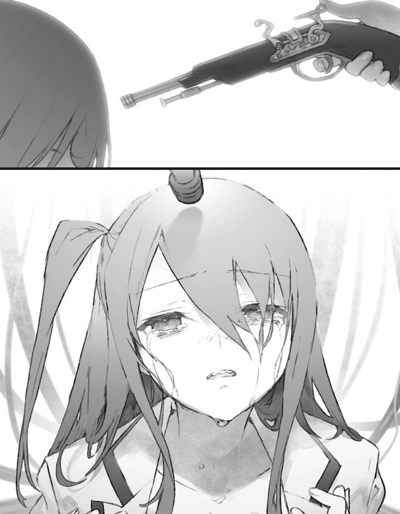 Penampilannya tidak berubah. Namun, matanya yang berkilau memancarkan perasaan aneh. Dia terengah-engah. Dengan pandangan tenang, Kurumi mengarahkan pistolnya ke kepala Yuri.