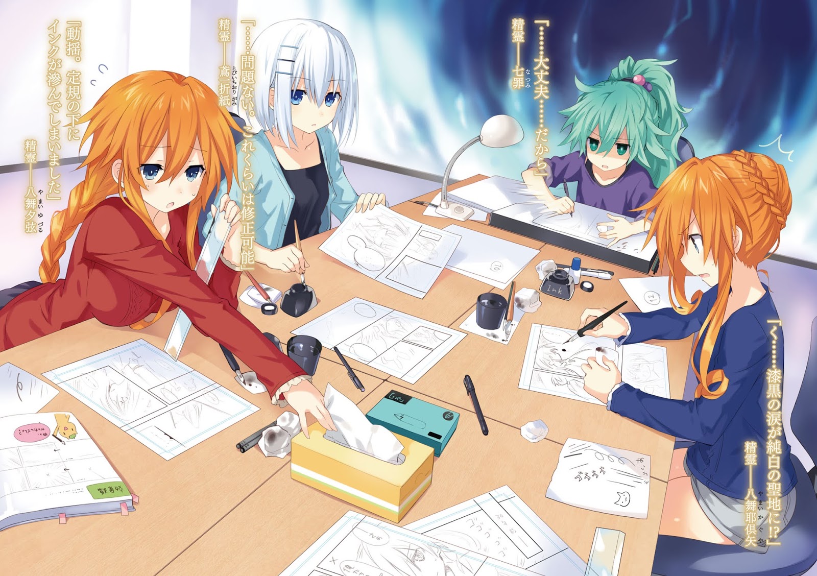 Di dalam ruangan besar, segunung pekerjaan telah dibagi menjadi beberapa kelompok; di atasnya telah ditempatkan tinta, pulpen, dan berbagai perlengkapan seni seperti penggaris.