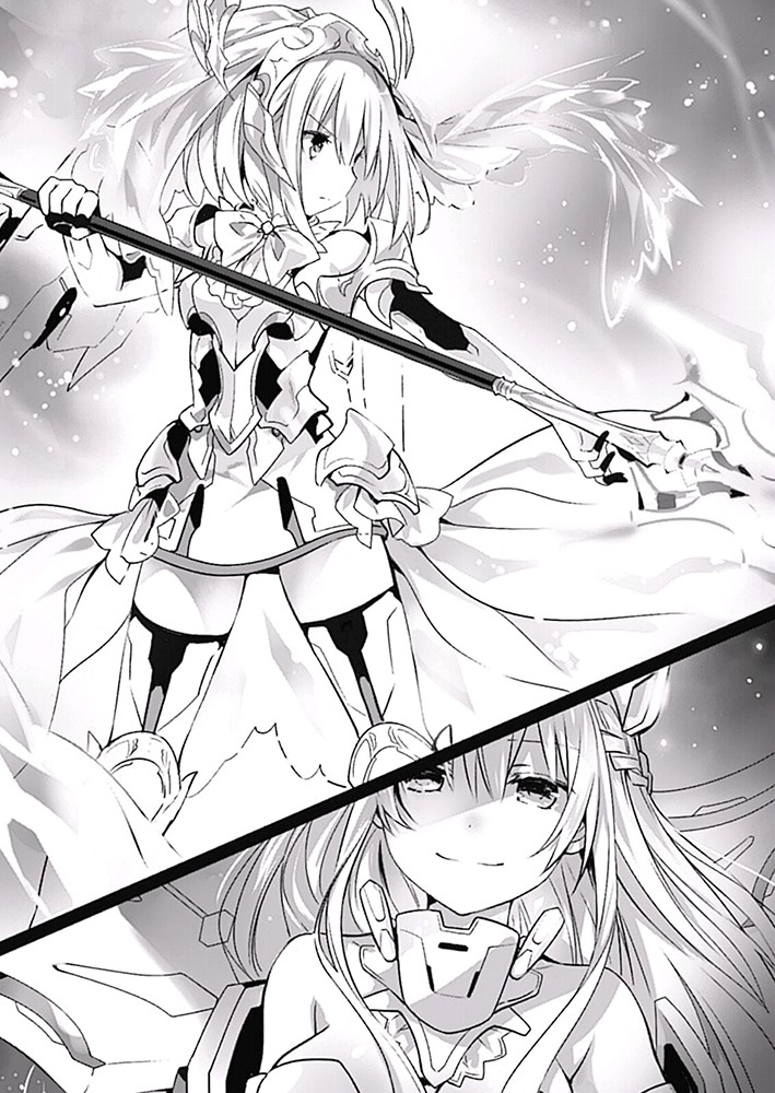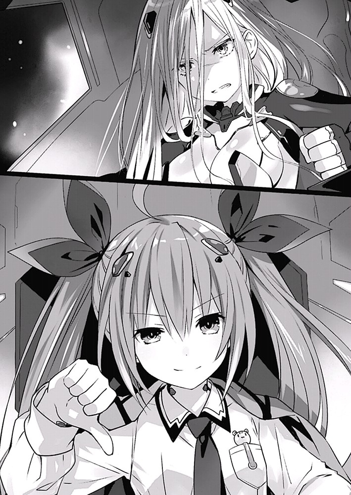 Origami mengarahkan pandangannya ke Artemisia dengan tatapan tajam, mentransmisikan instruksi melalui pikirannya ke <Metatron> yang membumbung di angkasa. Mengikuti arahan ini, setengah dari bulu-bulu itu menyebar di belakang Artemisia, memancarkan sinar laser dan menutup rute pelariannya. Setengah sisanya berkumpul bersama di ujung depan <Einherjar>, mengambil bentuk bor raksasa.