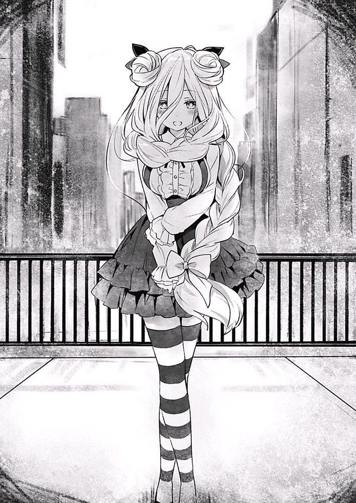 Sepasang matanya yang berkilau, diamant, yang memiliki pancaran seperti mimpi, dengan tenang menatap ke arah Shidou. Gaun Astral hitam legam yang hampir menyerupai kegelapan itu sendiri terkondensasi menjadi materi, melilit tubuhnya. Jika sekarang menjadi malam, lapisannya akan menyatu dengan sempurna ke langit.