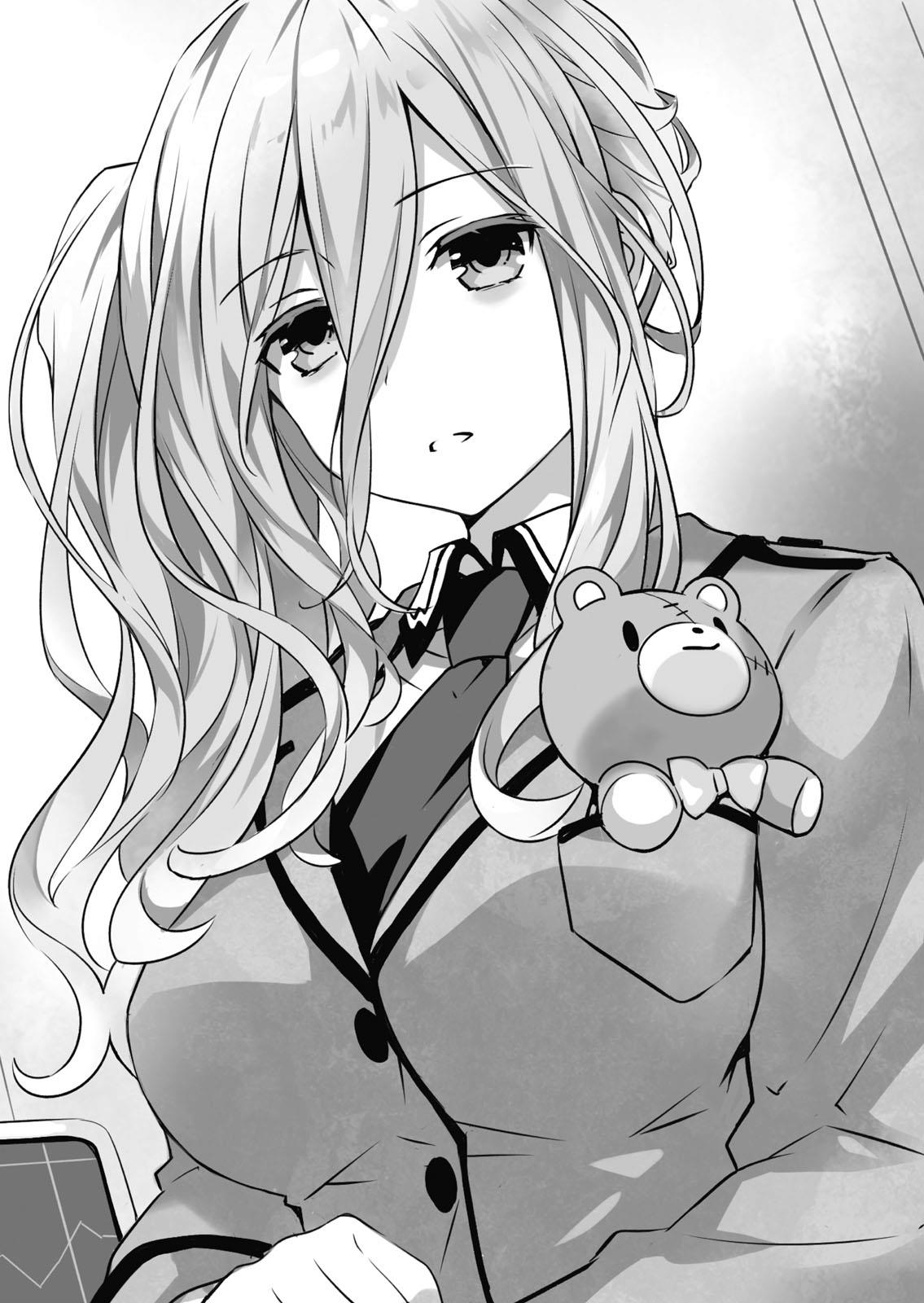 Terletak di depan garis pandangannya, ada sosok wanita lajang yang duduk di depan konsol. Dia memiliki rambut panjang yang diikat dengan sembarangan dan lingkaran hitam tebal di bawah matanya yang mengantuk. Dari saku dada seragam militer Ratatoskr-nya, tampak wajah boneka beruang dengan tanda tegas yang sedikit mengintip keluar.