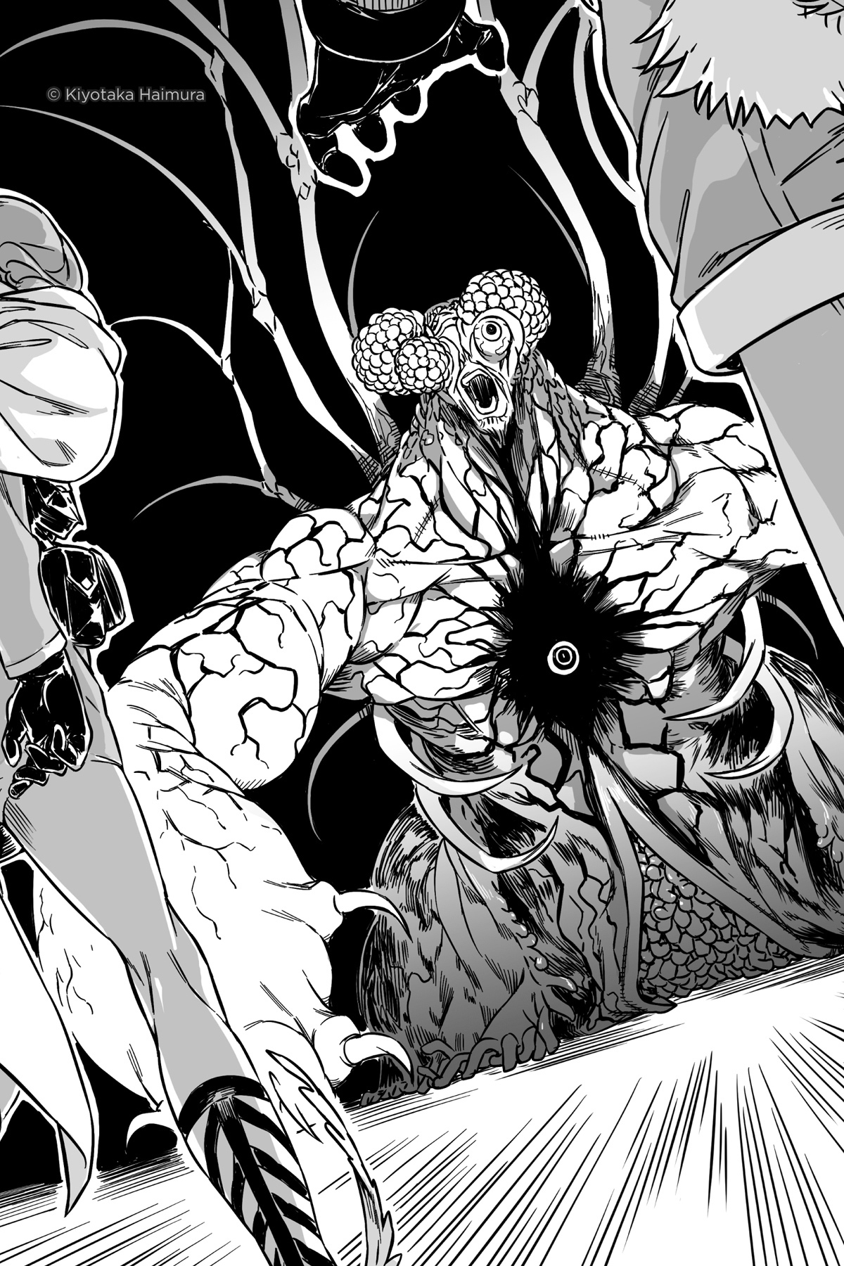 Tidak lama setelah itu keluar dari tenggorokannya, tubuhnya membengkak. Itu telah berubah menjadi sosok raksasa di luar pengakuan manusia.