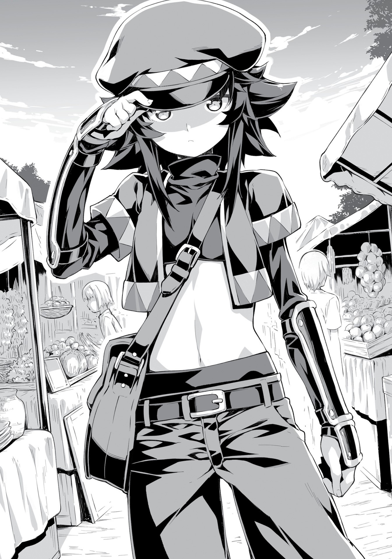 Mata gadis itu yang berwarna biru memandangiku dari bawah topinya yang kebesaran. Rambut hitamnya dipotong pendek, dan dia berpakaian serba hitam, pakaiannya pas dengan bentuknya untuk memudahkan gerakan. Saya pikir dia tidak boleh lebih dari 150 sentimeter.