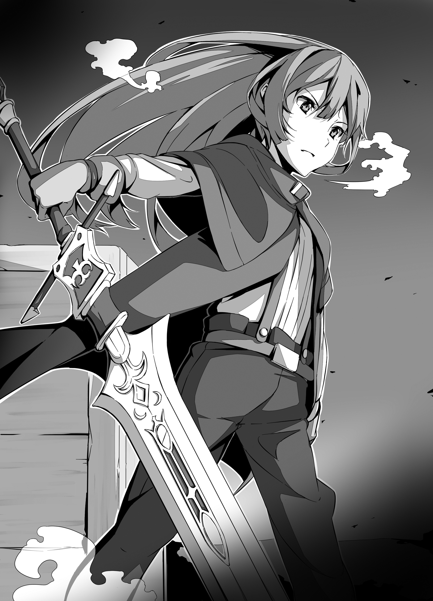 Tubuhnya diseret bersama dengan berat pedang. Ujungnya menabrak tanah; pada saat yang sama, dentuman logam yang tumpul terdengar saat penjaga silang itu menampar lutut kirinya sendiri.