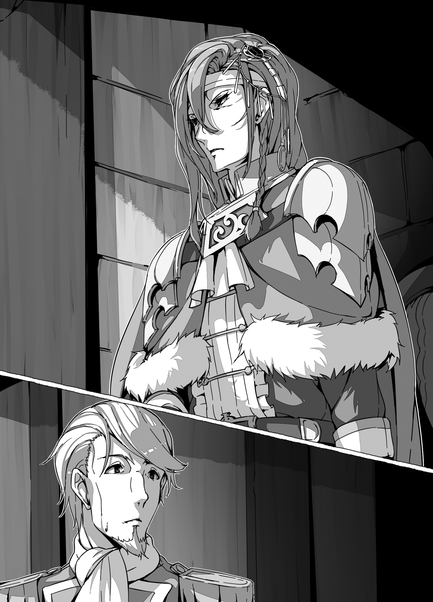 Juga hadir di sekitar meja adalah sembilan orang lainnya, terutama termasuk komandan tua dari Tentara Ketiga dan seorang ksatria muda yang mengumpulkan sisa-sisa Tentara Ketujuh. Prajurit berbaju besi berat berjaga-jaga di dekat tembok.