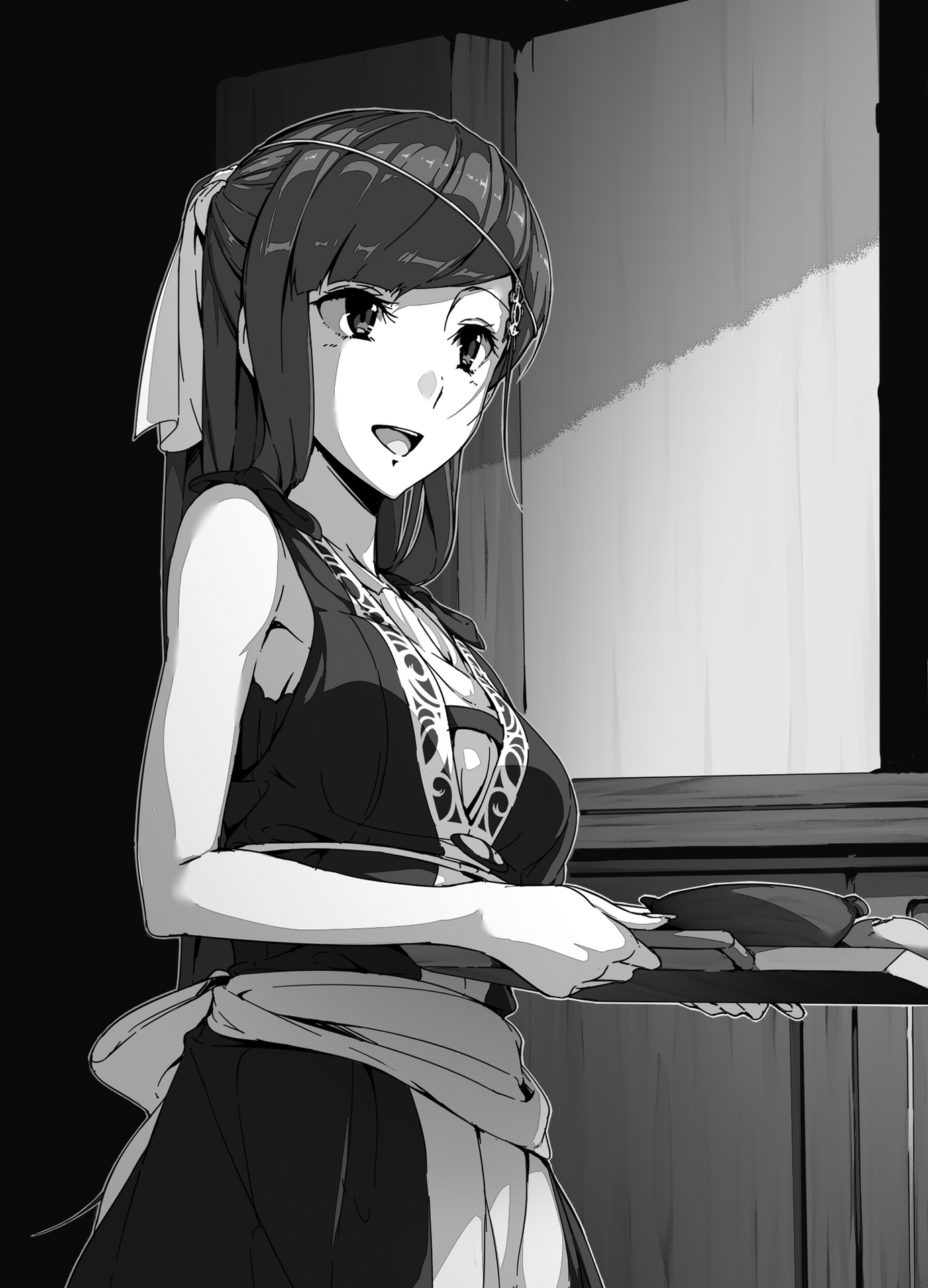 Fanrine meletakkan nampan itu di atas meja yang sekarang sudah dibersihkan. Pada pemeriksaan lebih dekat, roti bukanlah satu-satunya makanan ringan yang dibawanya—di samping itu ada jeruk kupas dan irisan buah persik.