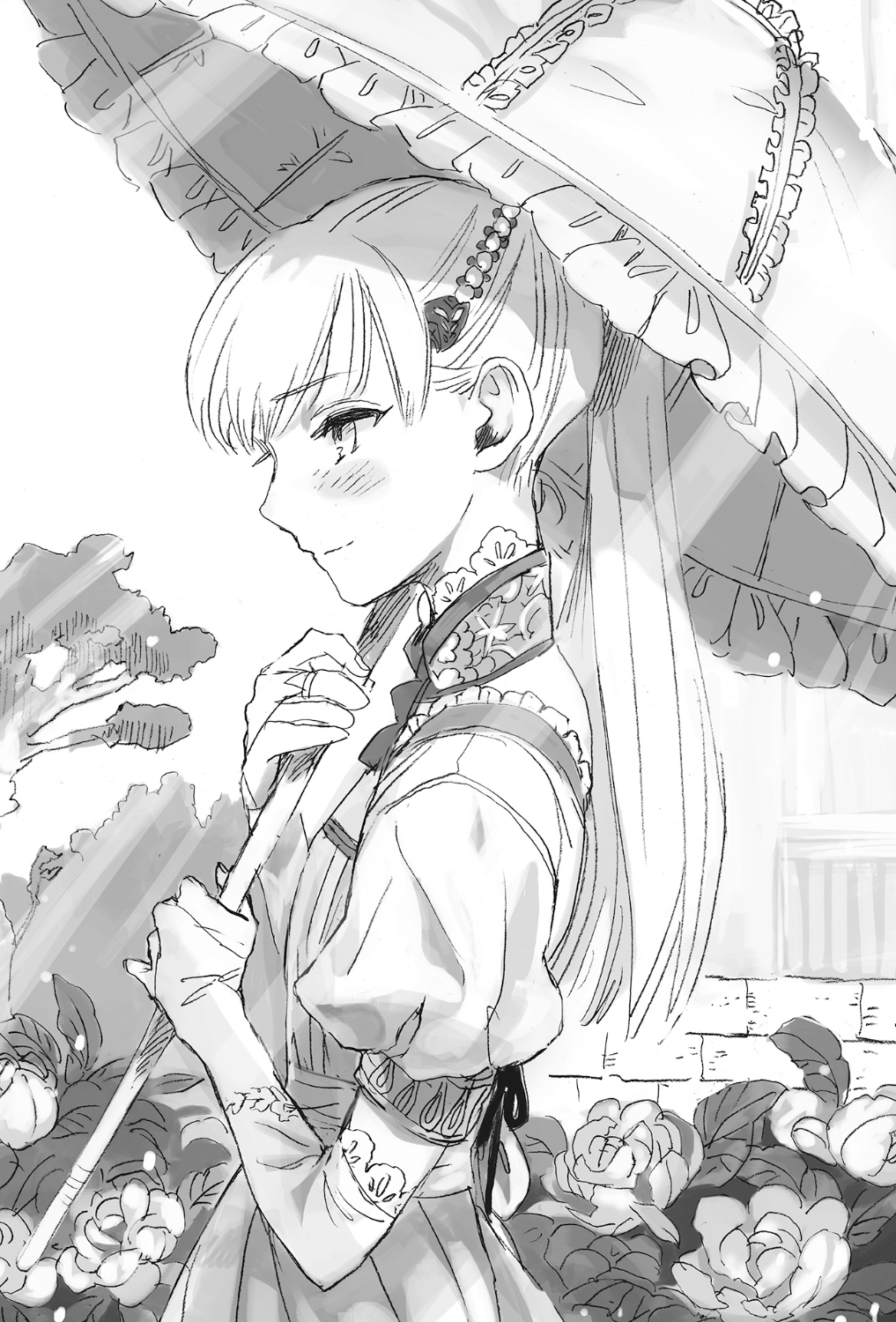 Seyruun berpakaian seperti pelayan seperti biasanya, tetapi Silk mengenakan gaun merah muda. Selain itu, dia membawa payung biru.