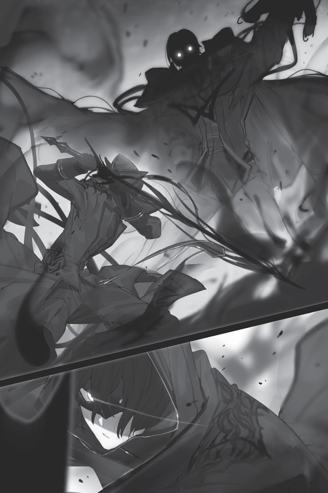 Aku menghembuskan nafas panjang lagi, dan bidang penglihatanku menjadi jelas. Aku memperhatikan sekelilingku dan merasakan bayangan aneh bersembunyi di belakangku.