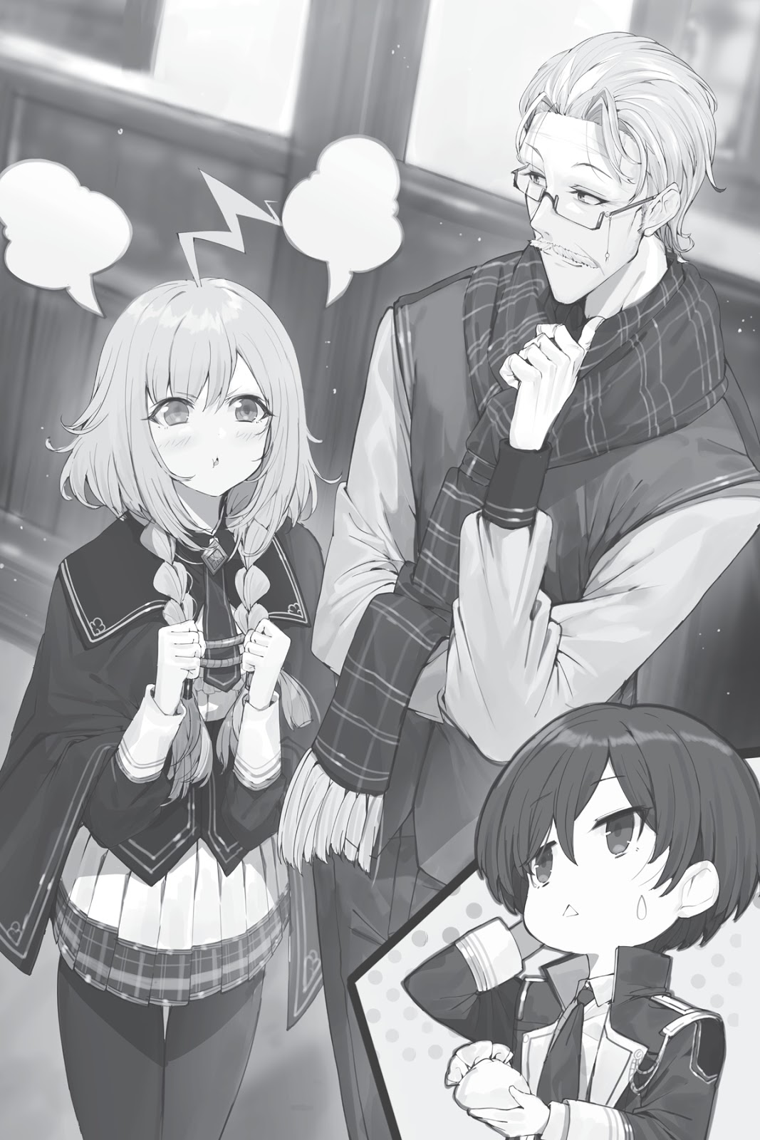 Kampus ini mengasumsikan rona oranye matahari terbenam. Saya berjalan melewati kampus, di mana tidak banyak siswa, ketika seorang gadis tiba-tiba mendekati saya. Seragamnya menunjukkan bahwa dia di tahun kedua di Akademi Sains. Rambut coklat gelapnya ditarik kembali menjadi sanggul. Sepasang kacamata menjemukan menutupi matanya yang coklat tua.