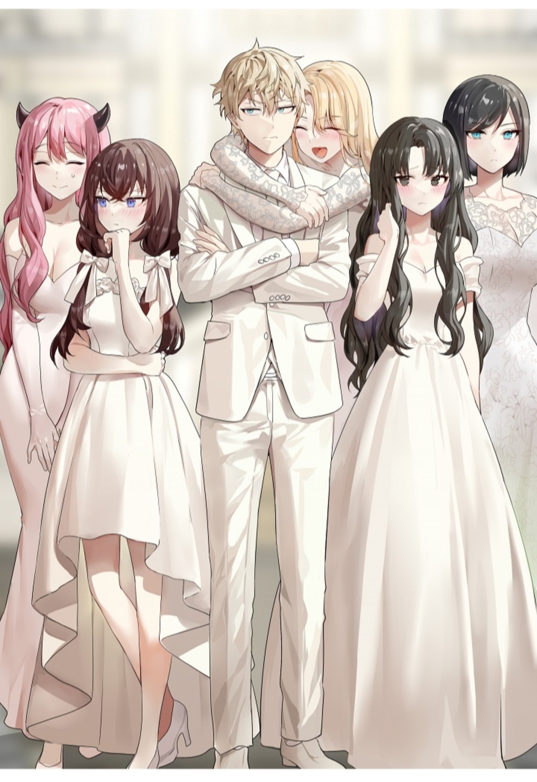 Masing-masing mengenakan gaun yang mempesona, mereka berdiri berdampingan ketika Raja Iblis, diposisikan di antara kelimanya, diam-diam membuka mulutnya.