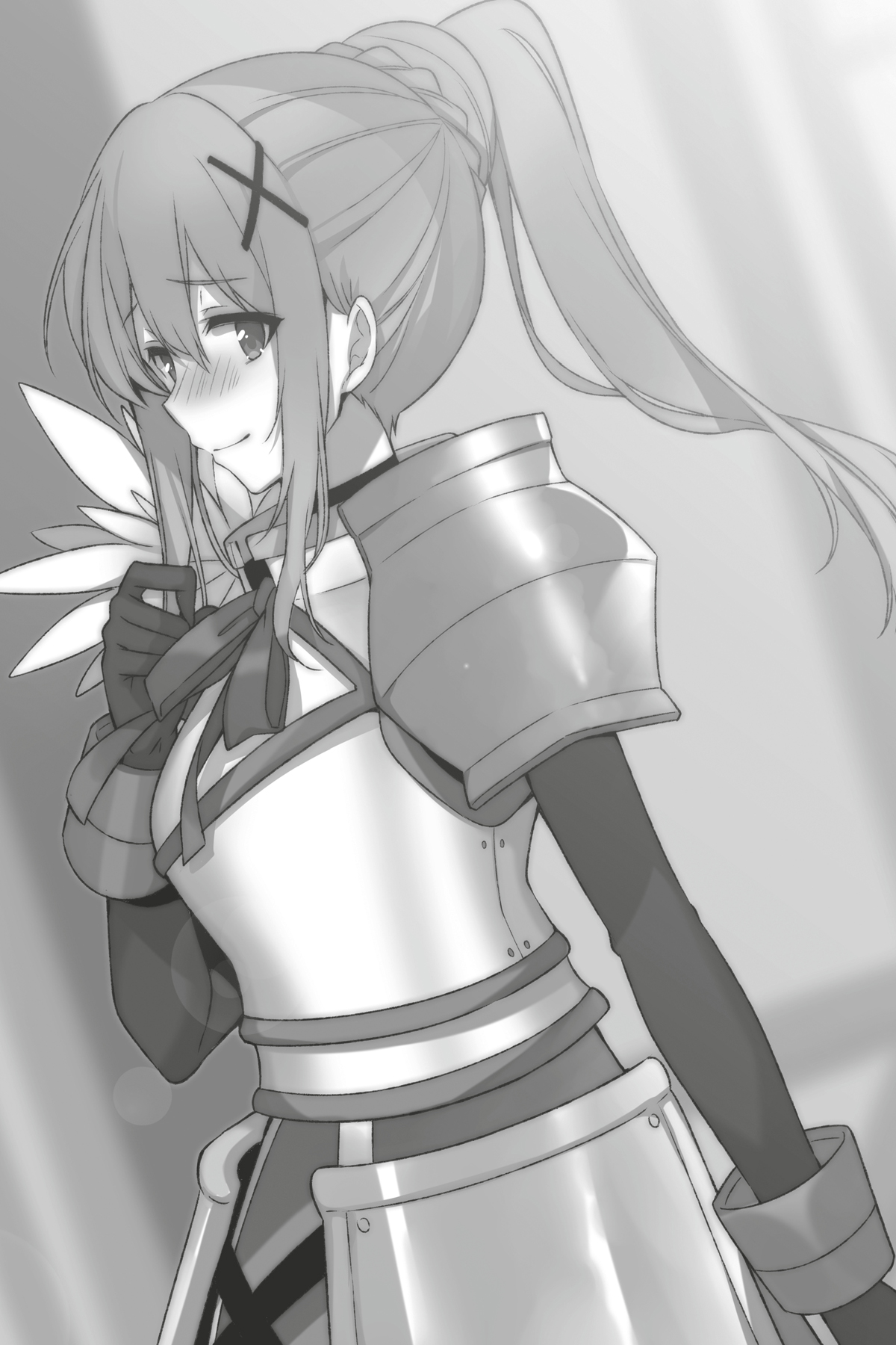 “I-item dewa? Hei, Kazuma, ada apa ini? Apakah baju zirah ini benar-benar barang suci?” Darkness bertanya, mengamati armor kotak obrolan dengan bingung.