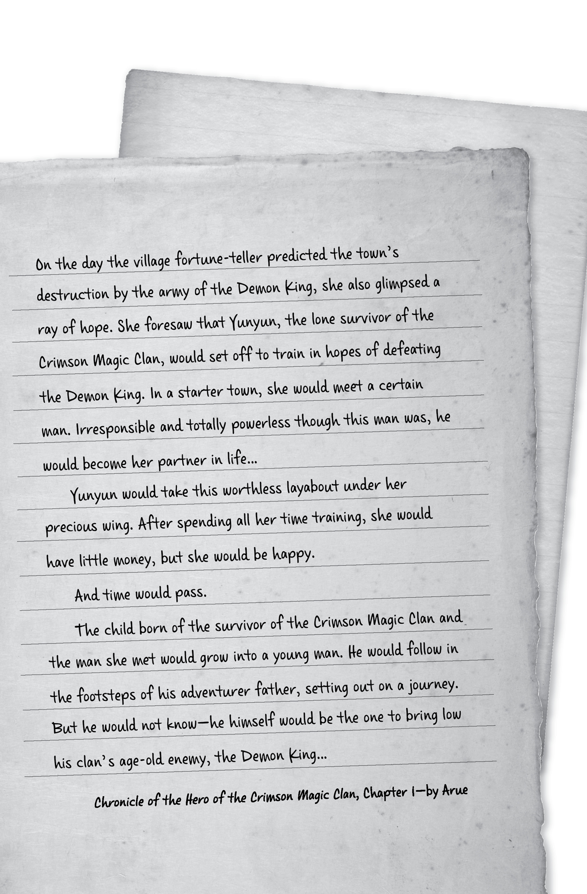 “Oke, saya akan terus membaca sekarang. ‘ … Dan waktu akan berlalu. Anak yang lahir dari penyintas Klan Sihir Merah dan pria yang dia temui akan tumbuh menjadi seorang pria muda. Dia akan mengikuti jejak ayahnya yang seorang petualang, memulai perjalanan. Tapi dia tidak akan tahu — dia sendirilah yang akan menjatuhkan musuh lamanya klannya, Raja Iblis …‘”