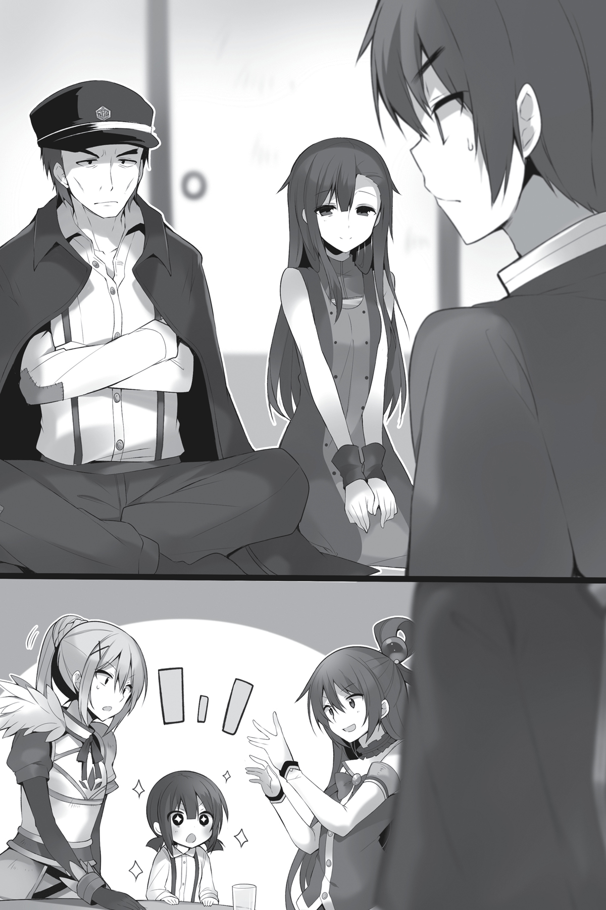 Darkness dan aku sama-sama bereaksi dengan kaget, tapi ketiga Crimson Magic Clanners tampak seolah-olah ini bukanlah sesuatu yang istimewa. Mungkin mereka belum pernah mendengar bagian tentang adanya seribu musuh di luar sana. Menurut perhitungan saya, seluruh desa ini adalah rumah bagi paling banyak tiga ratus orang. Lebih dari tiga kali lipat jumlah tentara Raja Iblis sedang dalam perjalanan, dan orang-orang ini bertingkah seolah itu bukan masalah besar.