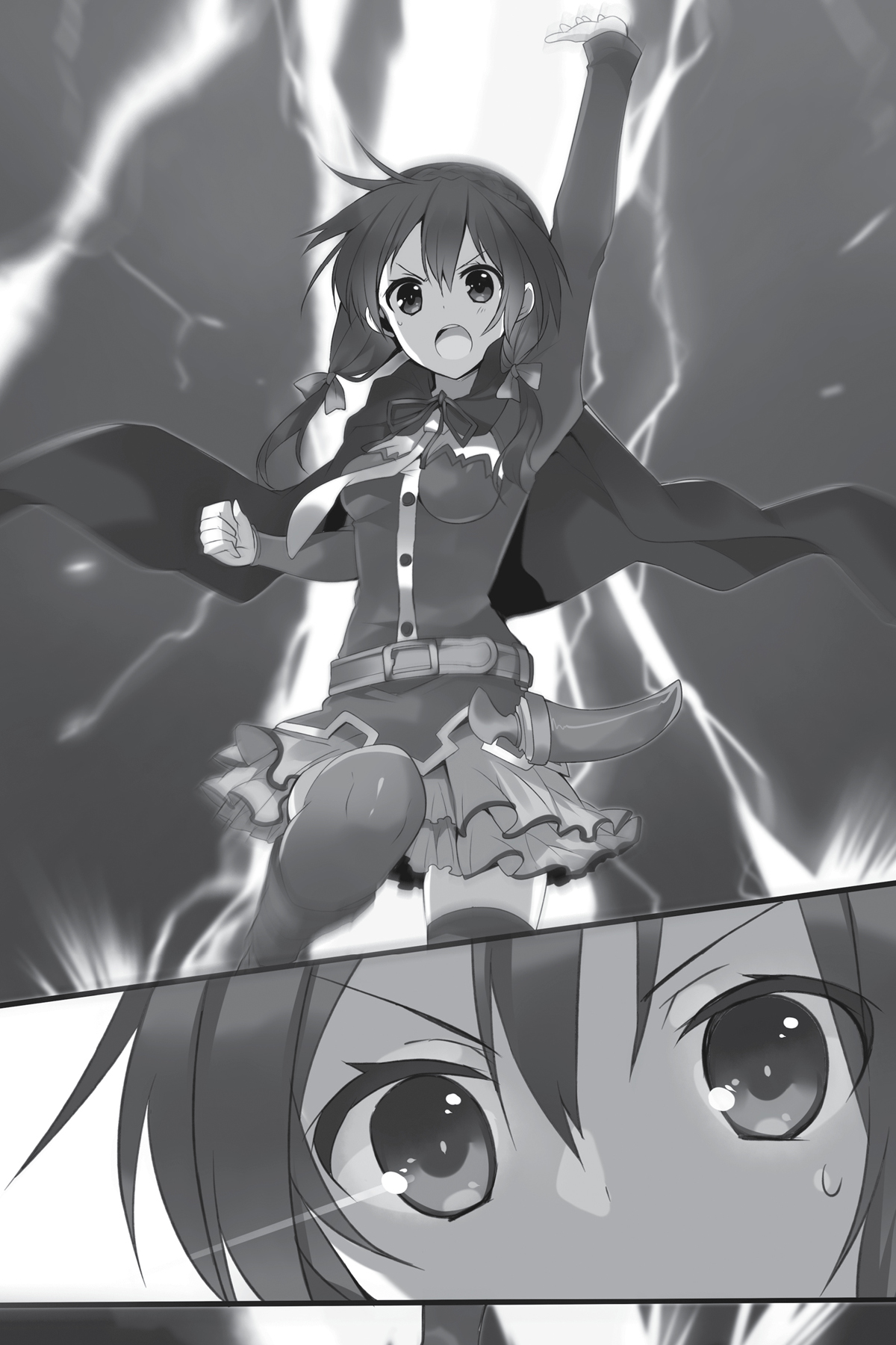 “Megumin, lihat ini. Aku baru saja menyelesaikannya — ini bab dua dari Chronicle of the Hero of the Crimson Magic Clan . Saya sangat senang dengan pemandangan di mana Crimson Magic Village terbakar. Ini adalah mahakarya saya. ”