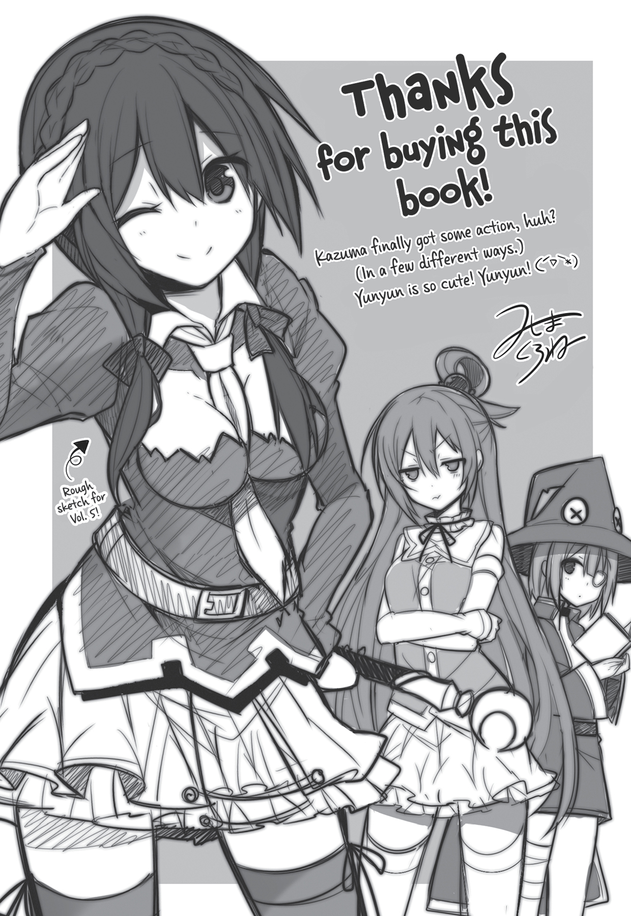 Seri ini mencapai lima volume secara praktis sebelum saya menyadarinya. Termasuk spin-off, Ledakan di Dunia yang Luar Biasa ini! , itu menjadi enam buku sekaligus. Kami telah menerbitkan dengan terburu-buru hingga saat ini, tetapi mulai dengan volume berikutnya, saya mengumpulkan kami akan menyesuaikan diri dengan kecepatan normal. Saya bersumpah itu bukan karena saya memohon kepada editor saya untuk memberi saya istirahat atau membiarkan saya bersenang-senang atau apapun. Itu hanya karena saya memiliki pekerjaan lain yang harus dilakukan. Betulkah.