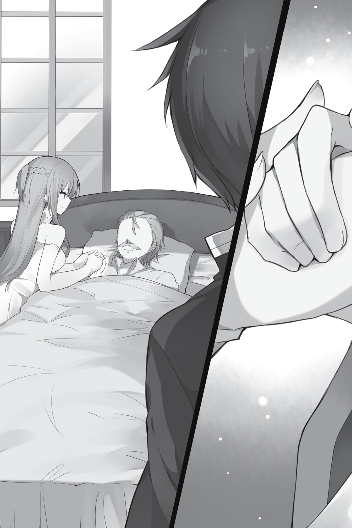 Dia bahkan lebih kurus dari saat aku melihatnya terakhir kali. Ada kantong hitam di bawah matanya, dan dia tertidur, menarik napas dalam-dalam. Suara masuk kita pasti telah membangunkannya, karena matanya terbuka lebar.