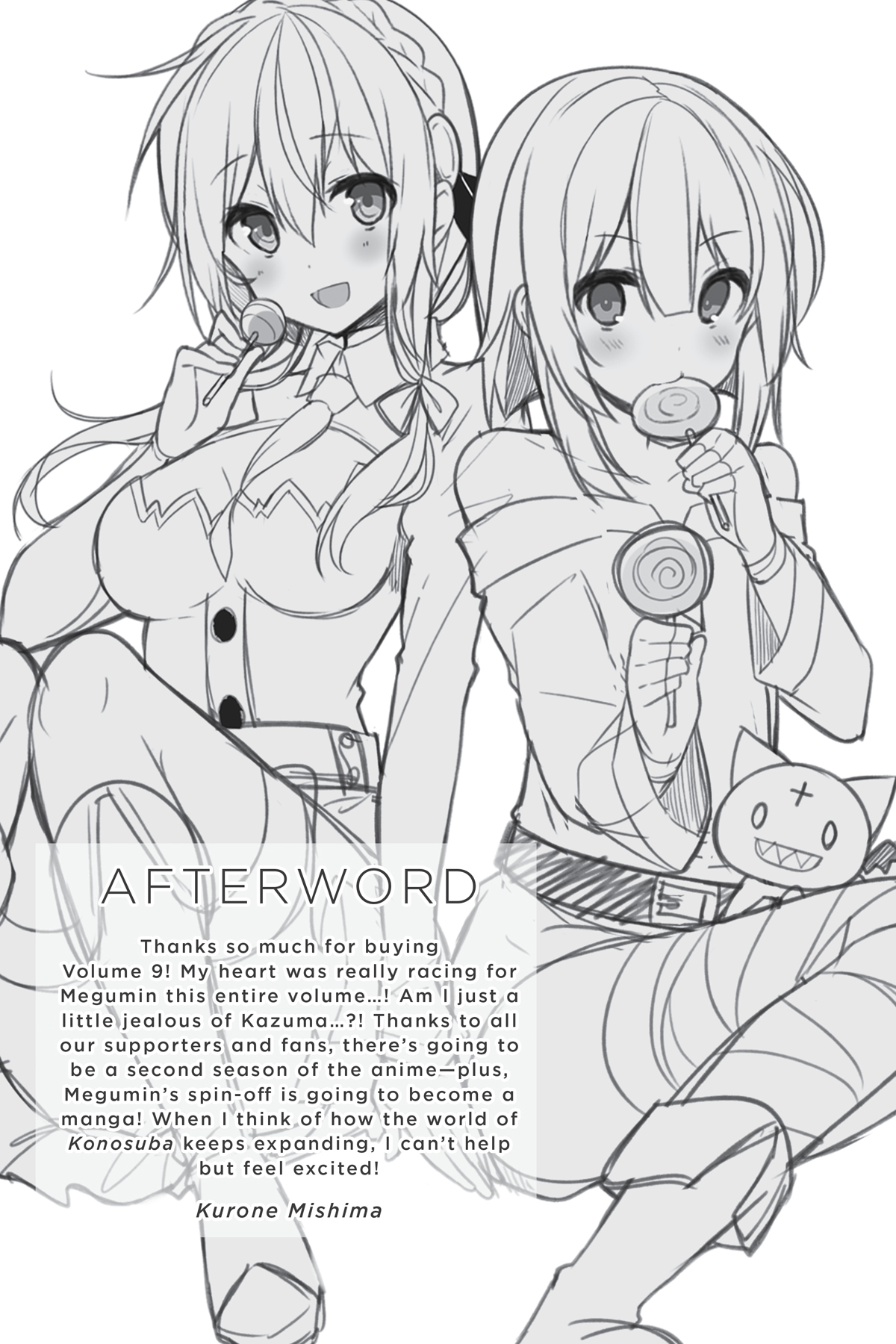 Terima kasih banyak telah mengambil Volume 9 dari seri ini. Seperti yang baru saja Anda pelajari, Konosuba mendapatkan musim anime kedua, jika Anda bisa mempercayainya.