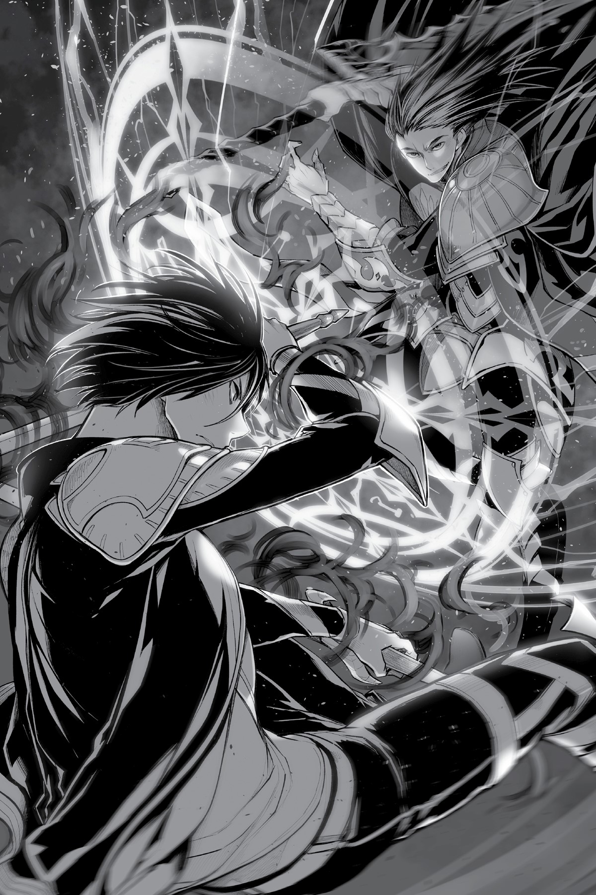 Sebuah cahaya hitam melesat keluar dari pedang Warma ster, membelokkan pedang pertama Seiya sebelum sang kaisar segera menggunakan God Eater seperti perisai untuk melindungi lehernya dari serangan yang masuk. Setelah itu, Warmaster mengambil serangan sekali lagi, menciptakan pola geometris di udara. Howe ver, pedang menyala ganda Seiya sudah menggambar pola yang sama! Merah dari sihir api dan hitam dari sihir gelap m ix dan bentrok beberapa kali di udara. Dengan setiap serangan, kecepatan pedang mereka meningkat sampai penglihatanku tidak bisa terus berjalan. Serangan mereka melampaui lingkup kecerdasan manusia … sampai api merah Seiya akhirnya mulai menyebar seolah-olah membenamkan kegelapan kaisar. Warmaster perlahan mundur.