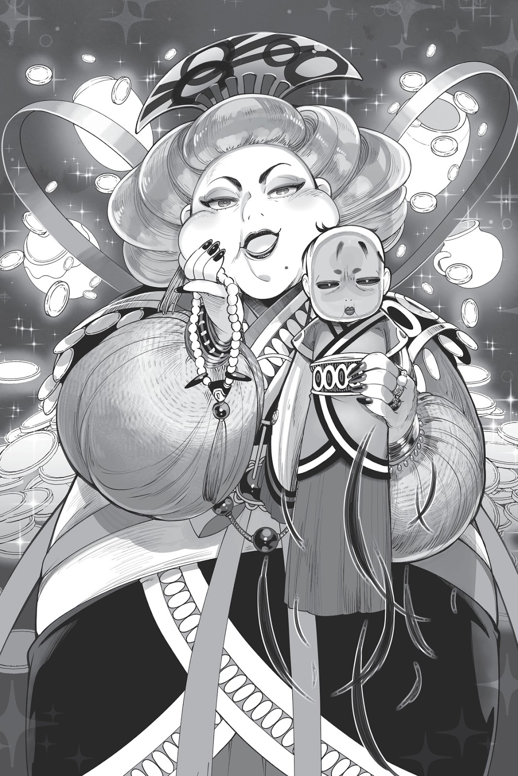 Dia bangkit dan perlahan berjalan ke arahku. Sang dewi adalah seorang wanita gemuk yang tampaknya berada di usia pertengahan. Dia mengenakan kimono emas keras dan berkilauan dengan berbagai jenis perhiasan dan rosario di leher dan pergelangan tangannya, yang bergemerincing dengan setiap langkah yang dia lakukan.