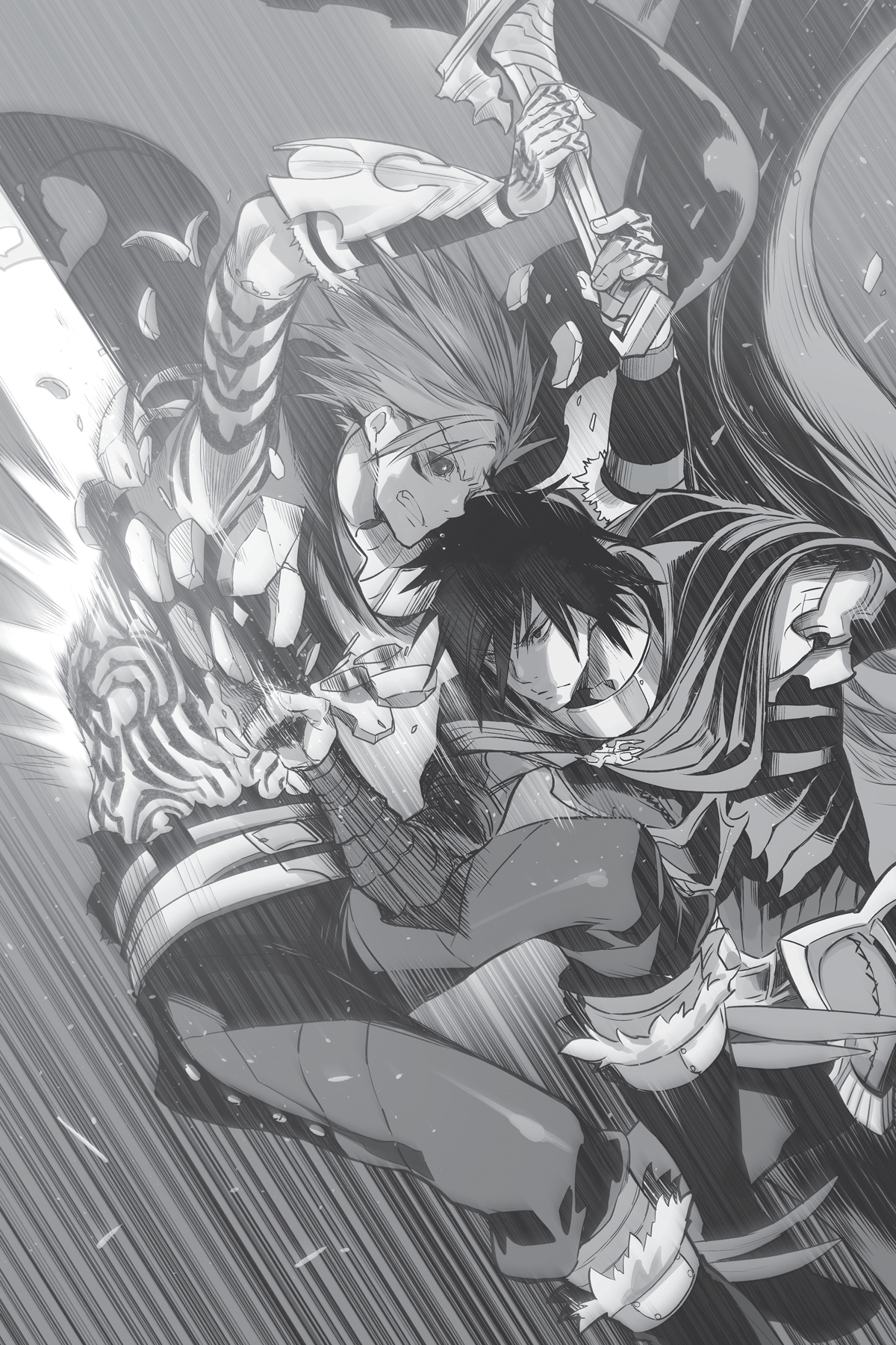 …Percikan api beterbangan di ruang kosong, dan suara logam bernada tinggi berbenturan dengan gema logam di sekitar area tersebut. Mash dan Seiya sekarang berada di posisi yang berlawanan dari tempat mereka berada beberapa detik yang lalu, dan dalam sekejap mata, mereka menghilang sekali lagi. Percikan api yang tak terhitung jumlahnya menembak liar ke udara. Mereka pasti bergerak sangat cepat sehingga aku bahkan tidak bisa melihat mereka, tetapi pada saat berikutnya aku melihat mereka, Mash mengayunkan Igzasion, lalu berdiri dengan takjub.