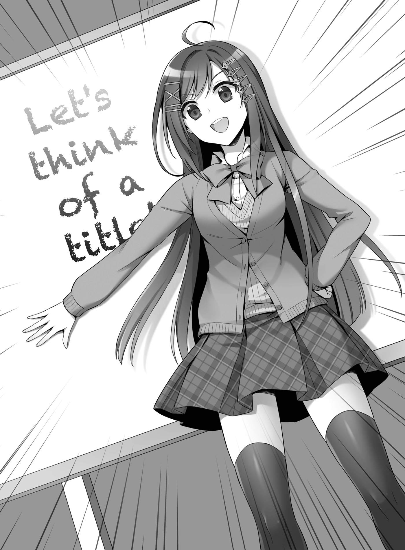 Mutsuko menulis “Mari kita pikirkan judul!” di papan tulis. Seperti biasa, tulisan tangannya sangat bagus.