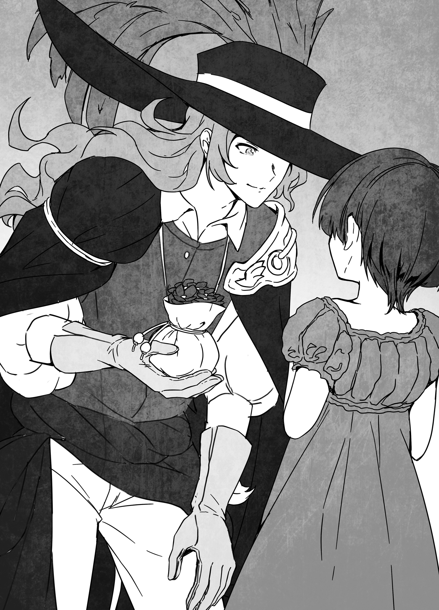 “Ya, izinkan saya untuk menghadiahi Anda!” kata seorang gadis berharga dalam gaun dari belakang pria itu. Dia tampak berusia sekitar lima belas atau enam belas tahun dan agak sakit-sakitan, tapi dia menatap kami dengan tegas.