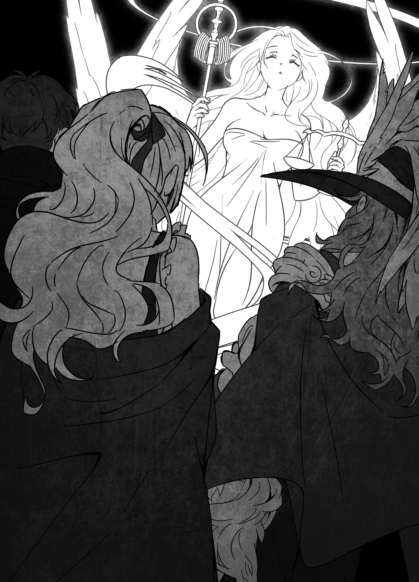 Itu adalah gambar samar dan transparan dari seorang wanita berambut panjang yang memegang timbangan dan tongkat. Ketika dia menutup matanya seolah-olah sedang berdoa, cahaya menghujani tongkatnya dan meresap ke dalam kata-kata di kontrak. Setelah cahayanya mereda, gambar tersebut larut ke udara seolah-olah secara bertahap kehilangan fokus dan kemudian menghilang seluruhnya. Yang tersisa adalah kontrak yang kami tulis. Agak menakutkan dan saya ragu-ragu untuk menyentuhnya sekarang, tetapi seseorang harus melakukannya, jadi saya menyentuhnya dengan jari saya.
