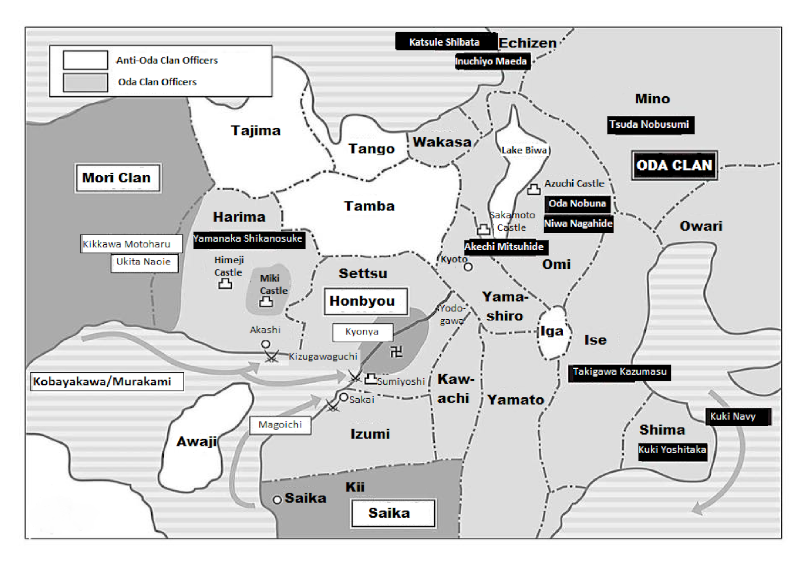 - ↑ Bijaksana dan Akechi memiliki kanji yang sama. Jadi, Anda juga bisa menerjemahkan judul Kobayakawa menjadi Akechi Commander.