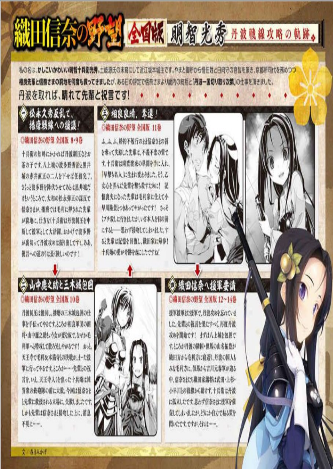 “Yamana Toyokuni. Sebagai pamanmu, penguasa Tajima dan pengikut Klan Oda, Yamana Suketoyo menolak untuk menyerah pada klan Mori, akhirnya kami telah mengirim utusan untuk mencapai gencatan senjata. Dengan ini, penindasan Inaba dan Tajima telah selesai. Motoharu Kikkawa ini akan membuka cara untuk melanjutkan ke ibukota segera. Sebagian besar penduduk asli negara Tanba termasuk Hatano Hideharu menemani klan Mori. Saat ini pasukan Akechi Mitsuhide telah diisolasi di Tamba – impian lama kita untuk mengunjungi ibukota akan terpenuhi begitu kita mengalahkan Akechi Mitsuhide. ”