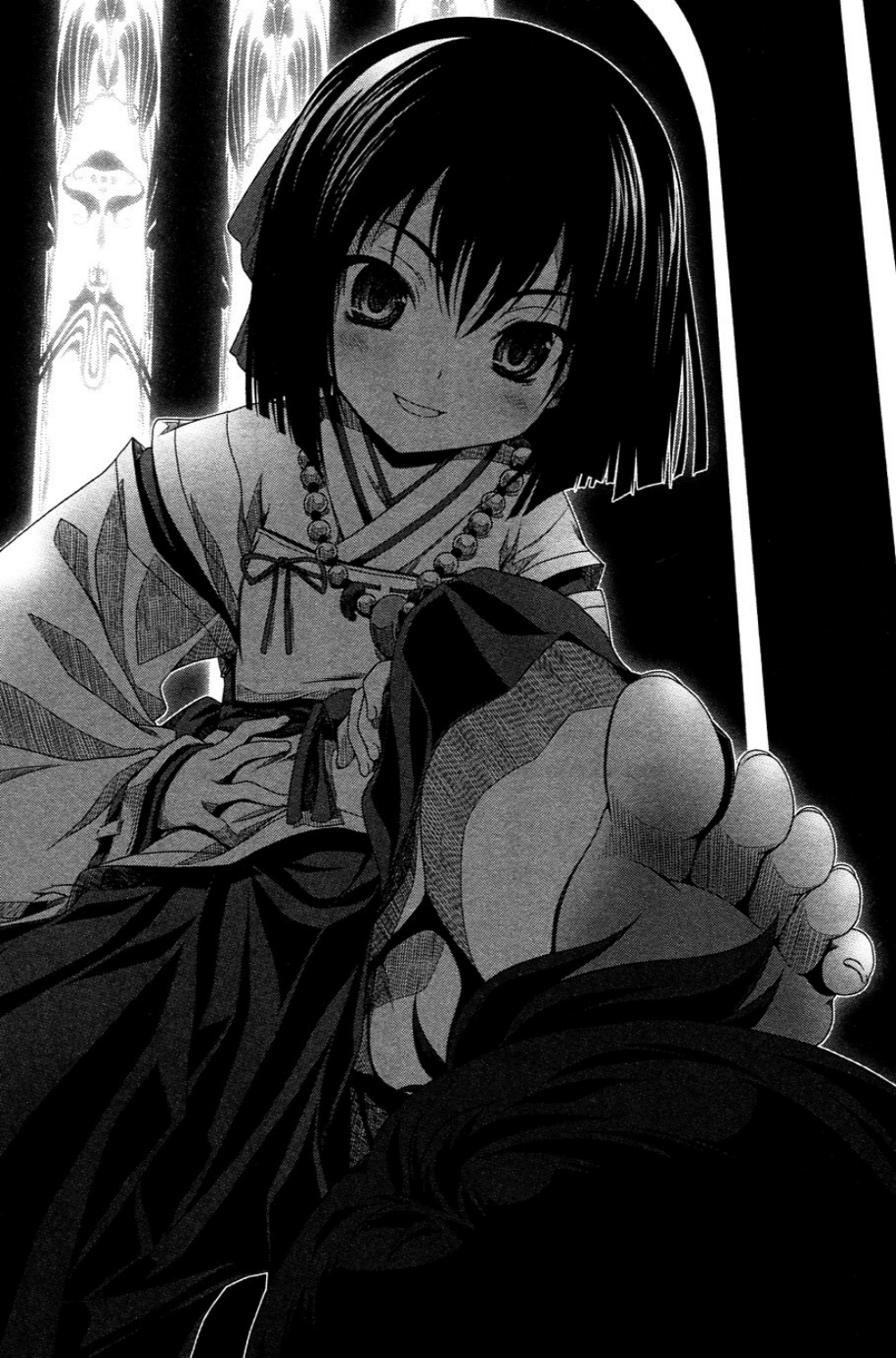 “Ise Grand Shrine awalnya adalah kuil khusus untuk royalti. Aturan ini tidak ada lagi, tetapi masih salah satu dari kuil utama Jepang. Alasannya adalah, dari ‘Tiga Harta Karun Suci’[7] ‘, Kusanagi no Tsurugi, Yata no Kagami dan Yasakani no Magatama, cermin Yata no Kagami disembah di sini. Dari dua harta lainnya, Kusanagi no Tsurugi disembah di Kuil Atsuta di wilayah Nobuna-sama, dan permata Yasakani no Magatama tenggelam ke laut Setouchi selama perang Genpei, membawa Jepang ke era sengoku yang kacau balau ini. Dikatakan bahwa jika kita menemukan Yasakani no Magatama, kita mungkin mengakhiri era kacau ini, tetapi karena tenggelam ke kedalaman yang sangat dalam dari laut Setouchi, akan sangat sulit untuk diselamatkan … * Hiks * Hiks *