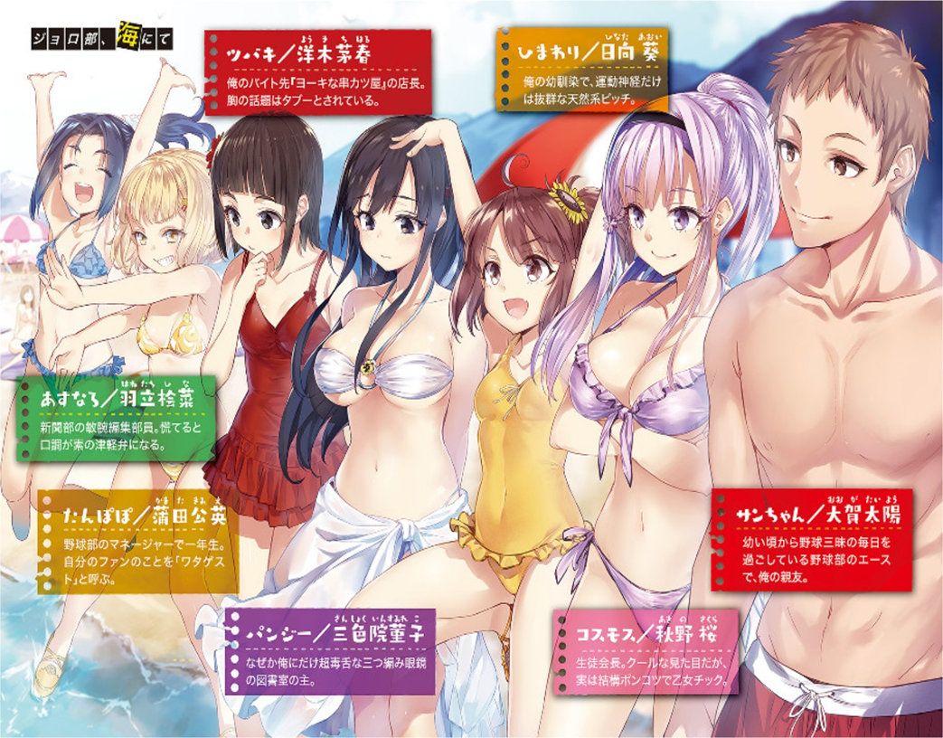 Yah, orangnya banyak, jadi saat aku menyelesaikannya …, anggota yang datang ke laut adalah aku, San-chan, dan Fu-chan. Seorang wanita datang dengan total sembilan anggota, termasuk bunga pansy, kosmos, bunga matahari, asunaro, kamelia, dan Tanpopo.