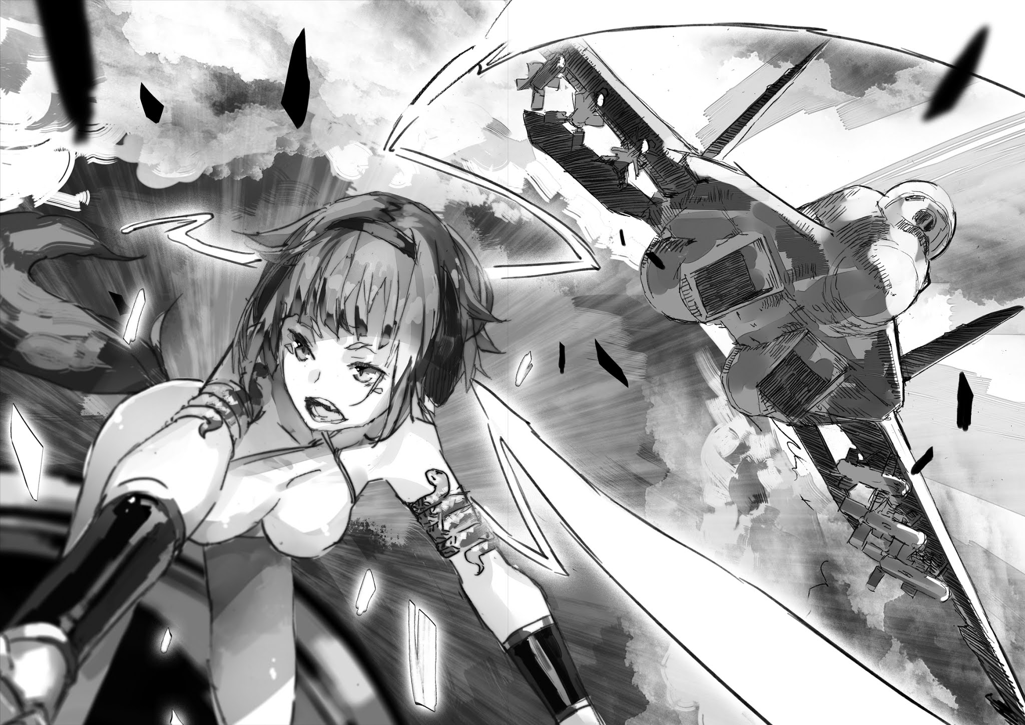 “Yaaaaarrrrrghhhhh!” Saya berteriak saat saya terlempar ke ruang kosong. Anehnya, perasaan saya terhadap waktu tampak melebar — mungkin karena adrenalin — dan segala sesuatu tampak terjadi dalam gerakan lambat. Elvia mengayun di udara, menahan Hikaru-san dan Christopher-san dengan kerah mereka. Myusel mengulurkan tangan dan menggenggam tanganku, dan aku meraih tangan Minori-san juga. Kami membentuk sebuah cincin, seperti kelompok latihan terjun payung, atau sesuatu yang keluar dari pria Gat *** (peringatan: peringatan pertunjukan yang sangat tua). Aku bisa melihat tiga peti berisi baju besi terlarang jatuh di dekat kami.
