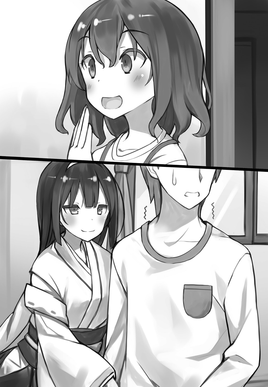 Dengan serangan Maki dan Kiriha, Koutarou tidak memiliki kesempatan. Tanpa sedikit pun niat buruk dalam tindakan mereka, dia bahkan tidak bisa menegur mereka. Dia akan menghabiskan lebih lama dalam posisi yang canggung ini jika dia melawan, jadi lebih mudah untuk menyerah.