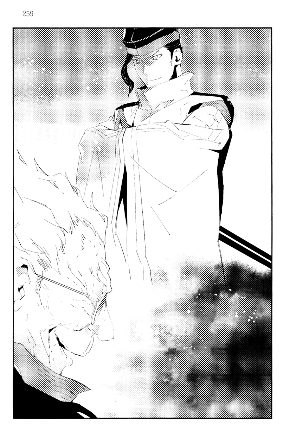 Doman juga memandang Ohtomo melalui kacamata hitam merah darahnya. Kemudian, Ohtomo menegakkan punggungnya, mendekatkan kaki kanan palsunya ke dekat kaki kirinya dan sedikit mengangkat dagu.