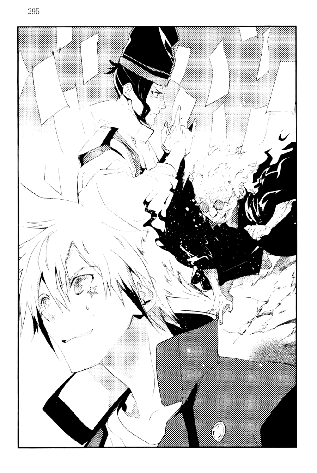 Di saat yang sama, shikigami Doman yang tersebar di sekitar atap berjingkrak-jingkrak sembari mengeluarkan tawa yang mengerikan. Ada seekor naga, masih terikat, dan kelompok Harutora yang tidak bisa melarikan diri dari penghalang, bersama dengan Onmyouji berpakaian hitam yang mendominasi situasi.
