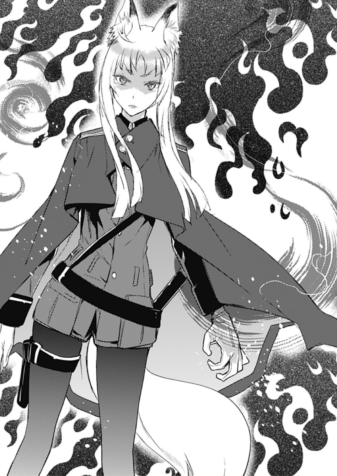 Harutora melompat mundur, menatap Kagami. Kon yang terwujud menggunakan api perlindungan sebagai tabir asap yang membara, dan Raven’s Wing segera berbalik untuk melarikan diri.