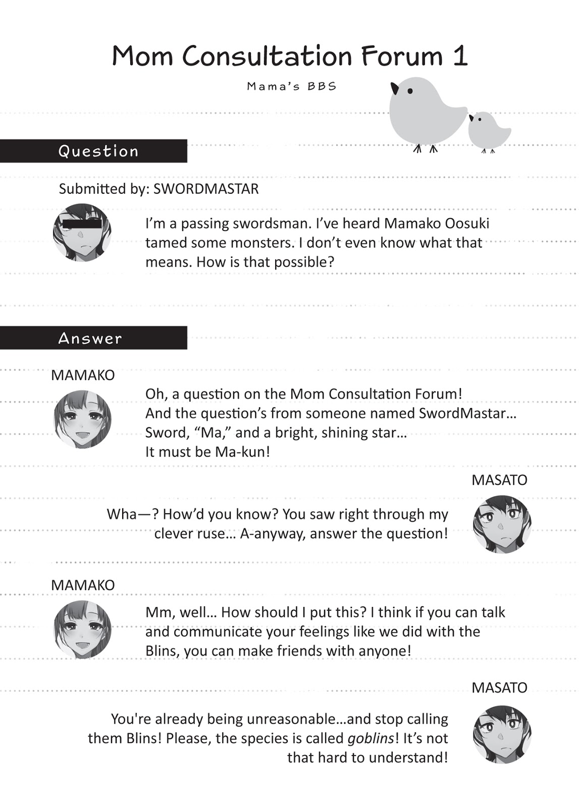 Interpretasi jelas dibutuhkan. Mamako melangkah ke samping para goblin, menjelaskan.