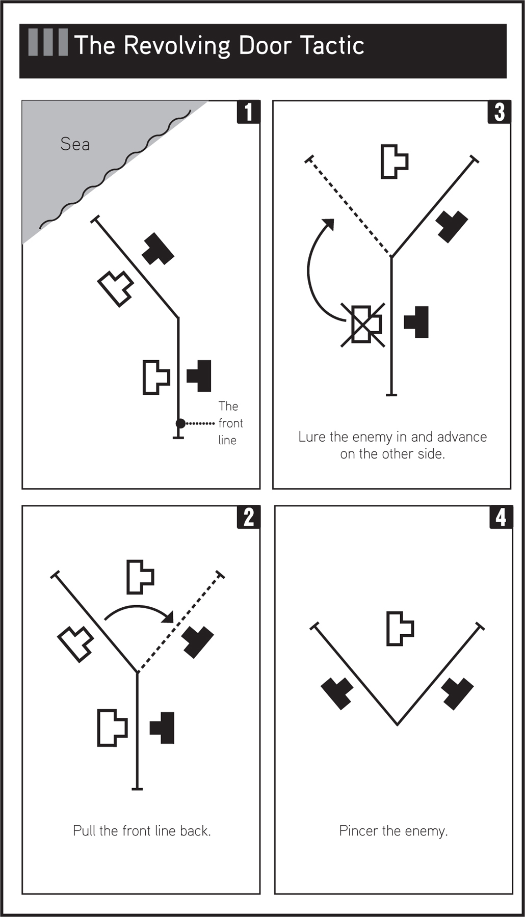 3 pintu putar Salah satu cara untuk memikat dan memusnahkan musuh. Untuk detailnya, lihat diagram di bagian belakang buku ini.